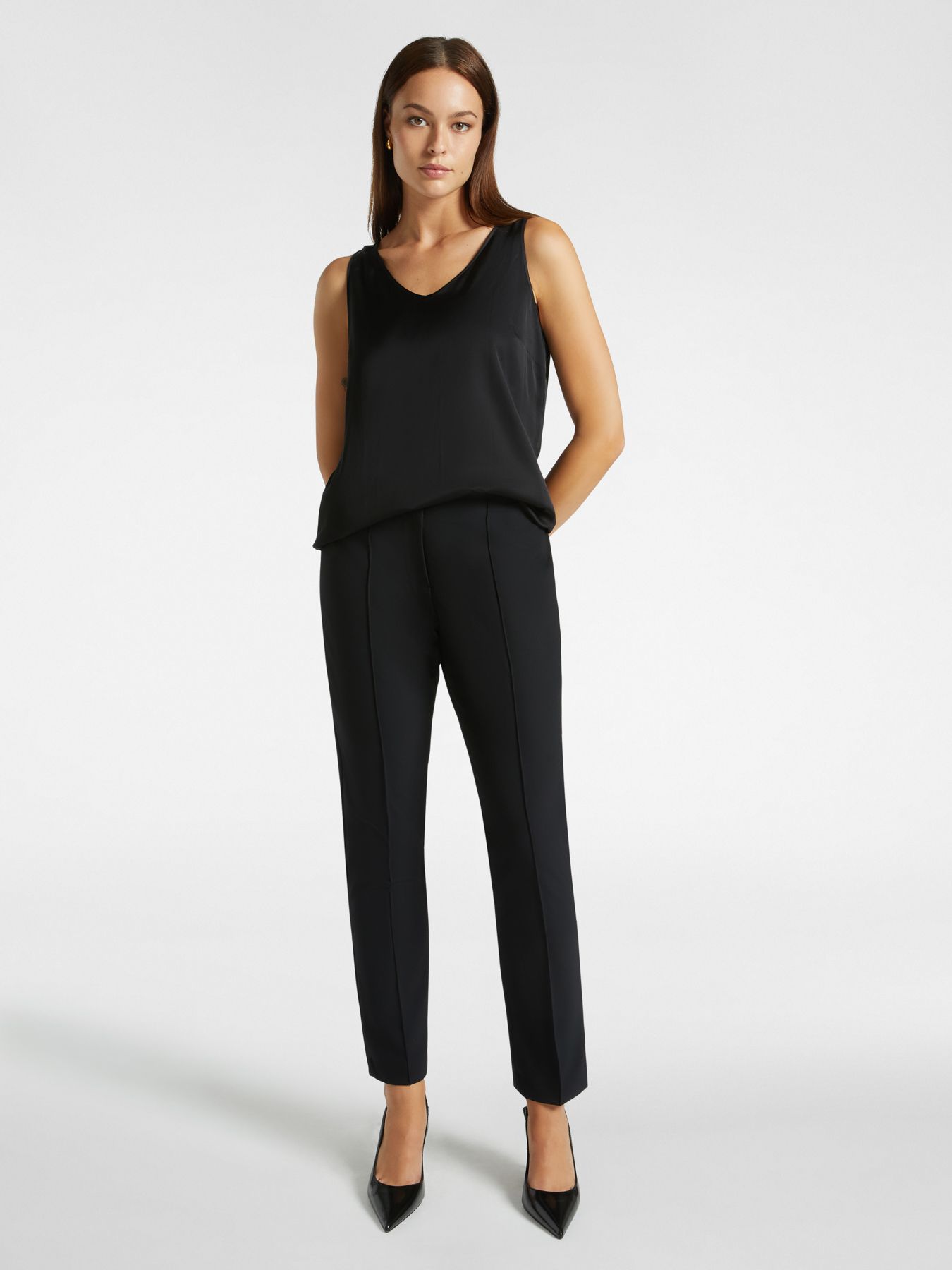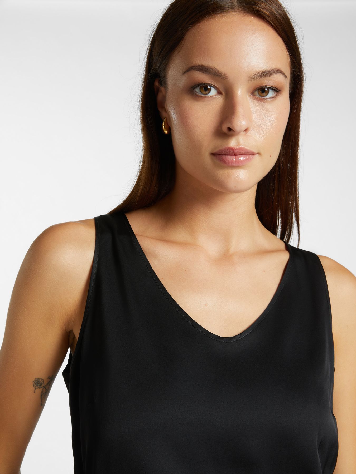 Топ выполнен из стрейчевой вискозы. Мягкий V-образный вырез подчеркивает элегантность модели, а облегающий крой позволяет сочетать вещь с кардиганом, рубашкой или блейзером.
