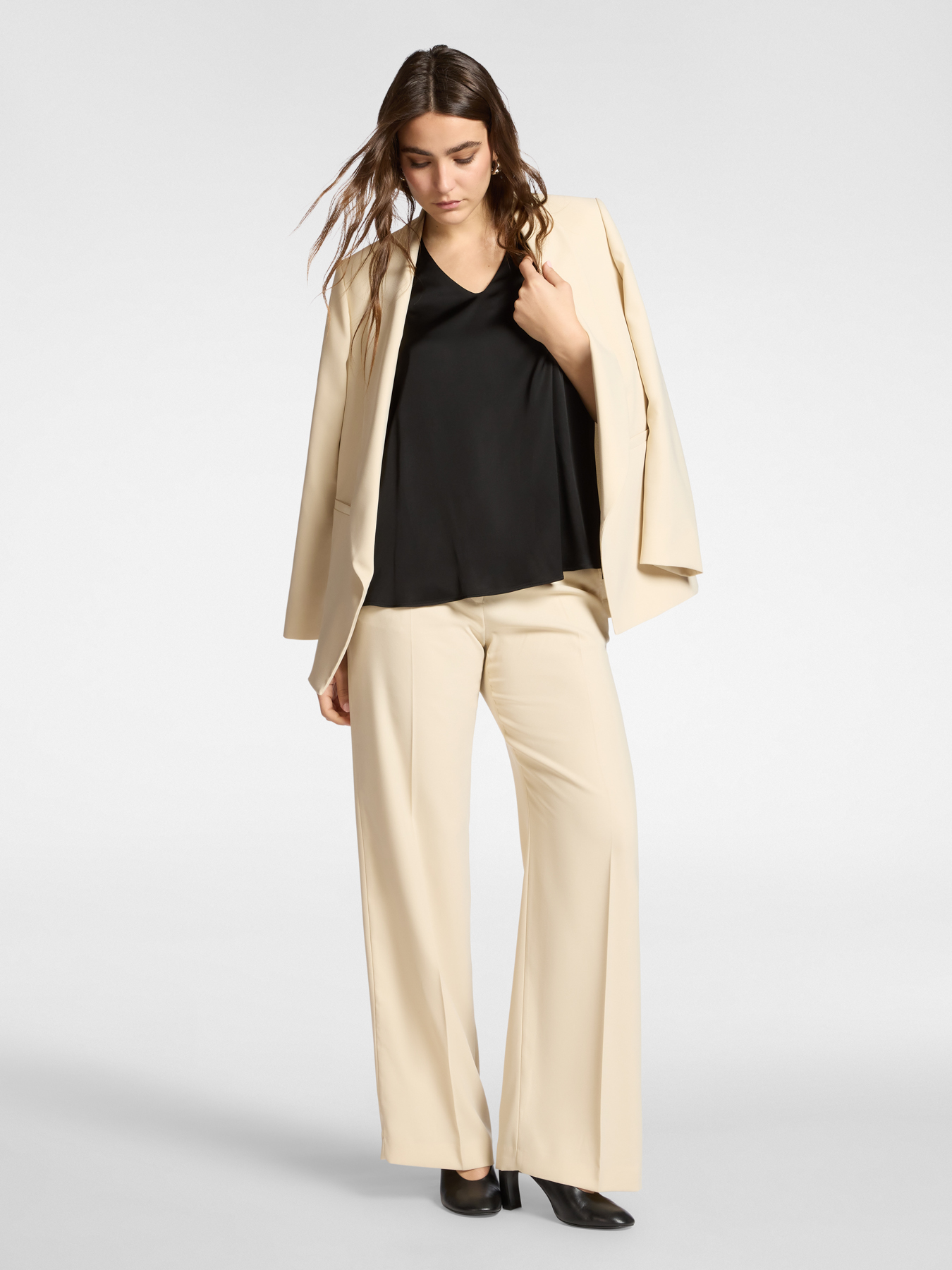 Топ из двух видов ткани: эластичного атласа и эко-вискозы. Удлиненная модель, V-образный вырез, облегающий крой. Незаменимая базовая модель. Прекрасно сочетается с кардиганами, рубашками и жакетами.