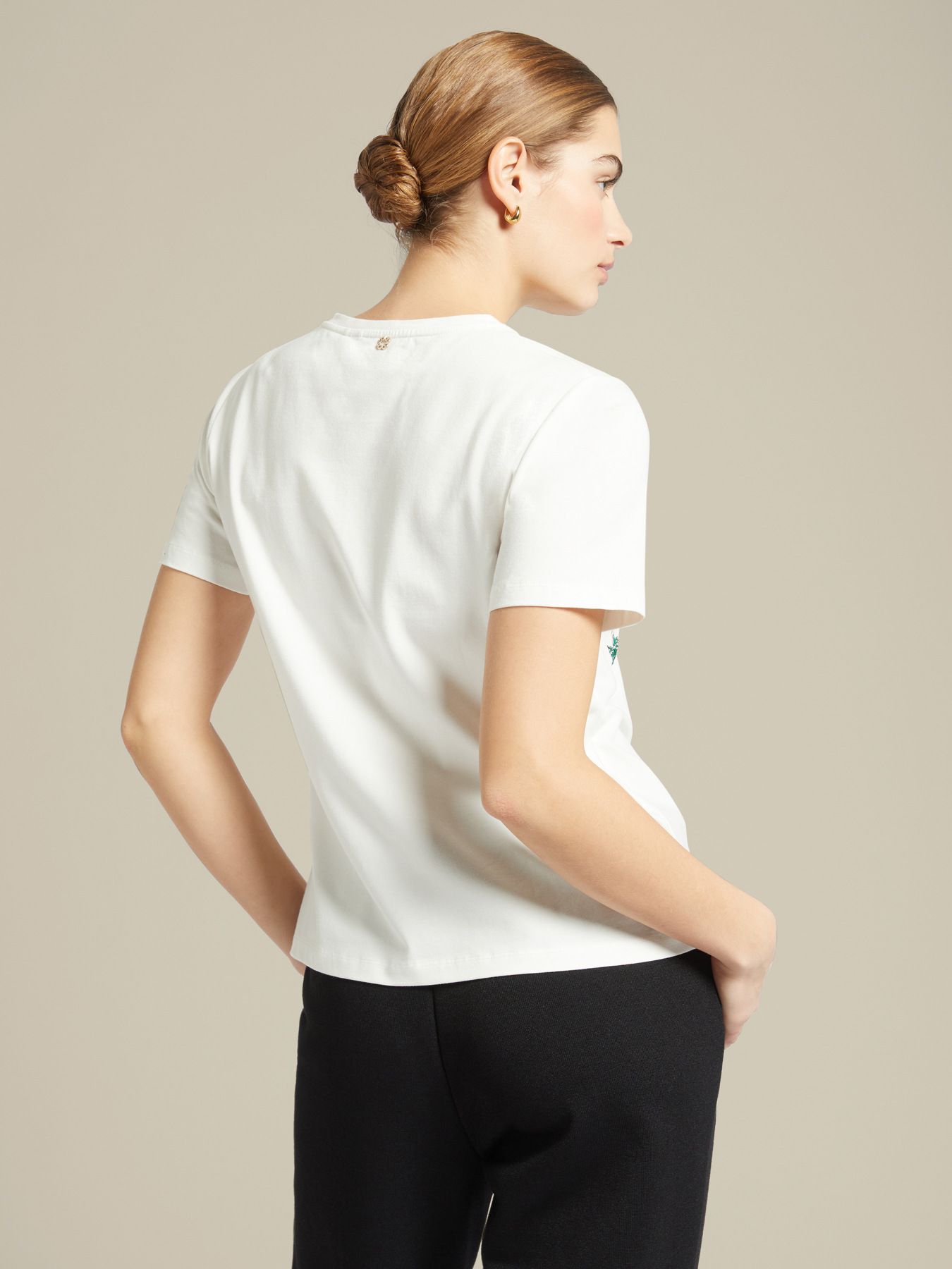 Женственная футболка с круглым вырезом из хлопкового трикотажа. Короткий рукав, приталенный крой, принт в виде цветов и стрекоз по всей поверхности, украшенный цветными бусинами и бисером, идеально подойдет для современного образа. Размер на модели: 46 RUS (44 IT) Параметры модели: рост 178 см, грудь 92 см, талия 66 см, бедра 101 см.