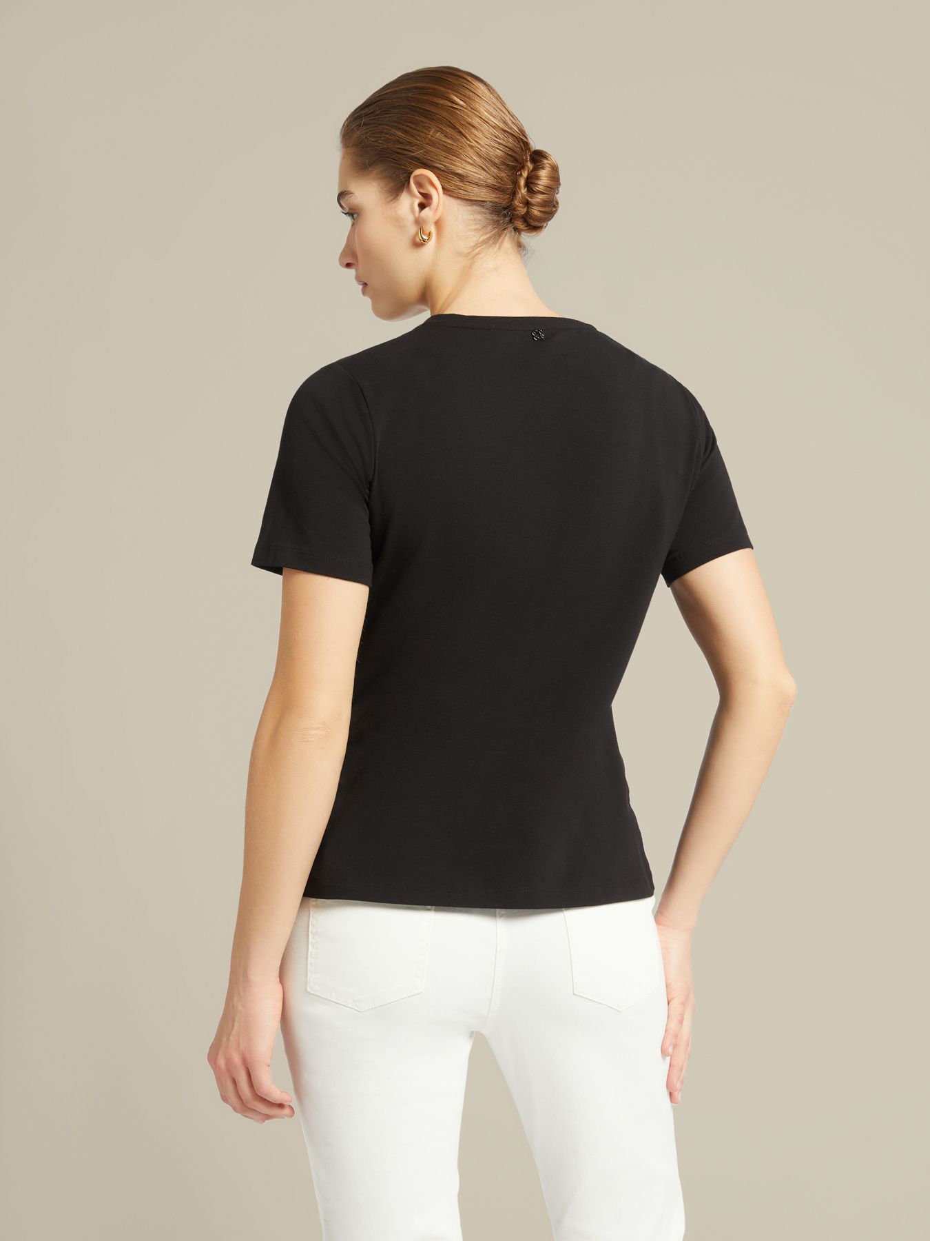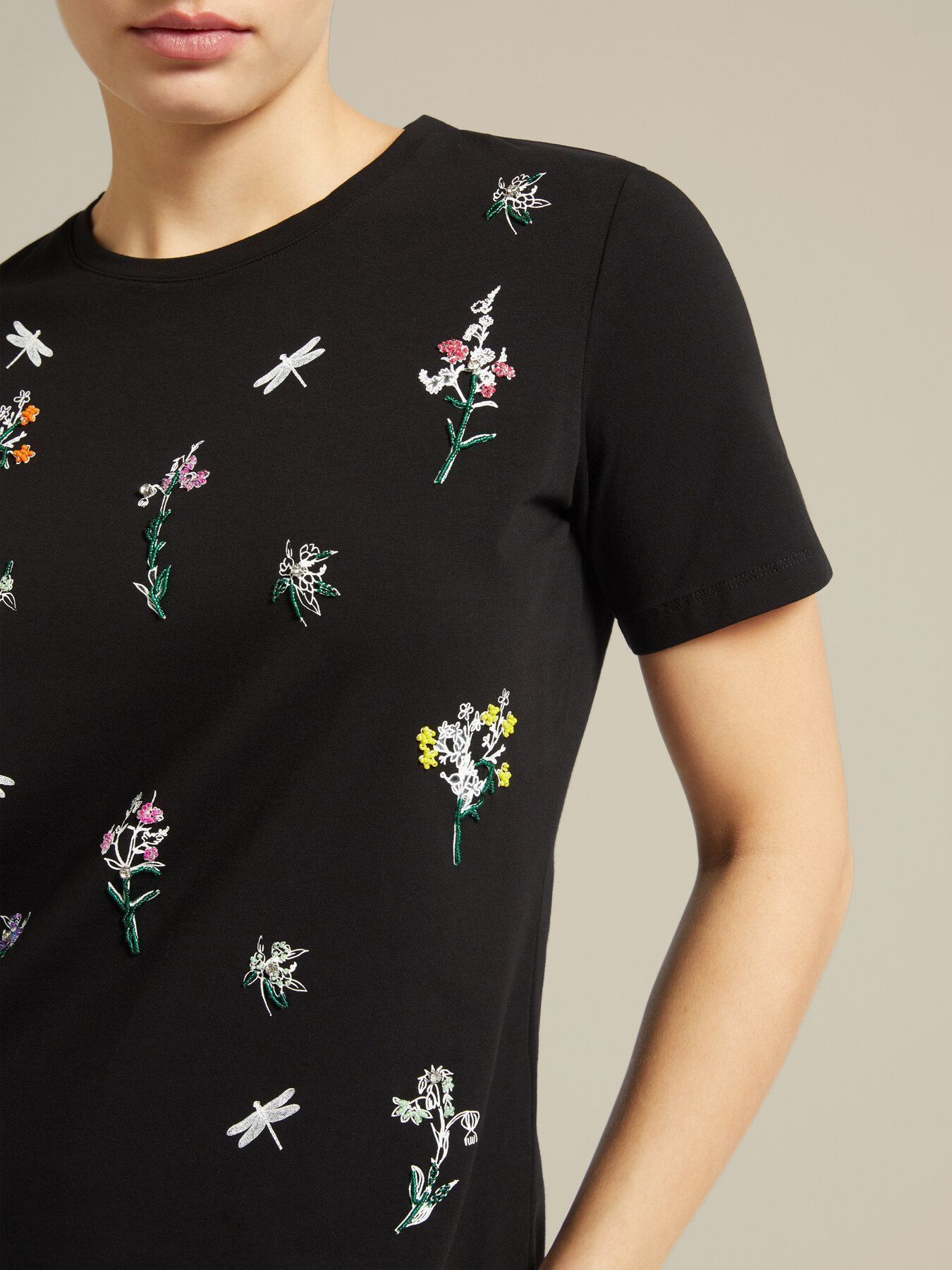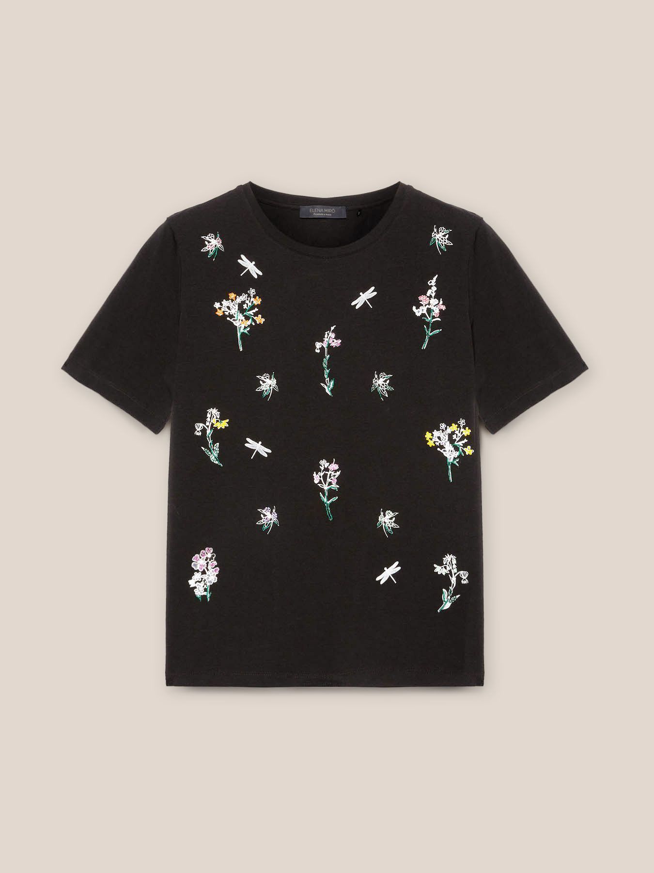 Женственная футболка с круглым вырезом из хлопкового трикотажа. Короткий рукав, приталенный крой, принт в виде цветов и стрекоз по всей поверхности, украшенный цветными бусинами и бисером, идеально подойдет для современного образа. Размер на модели: 46 RUS (44 IT) Параметры модели: рост 178 см, грудь 92 см, талия 66 см, бедра 101 см.
