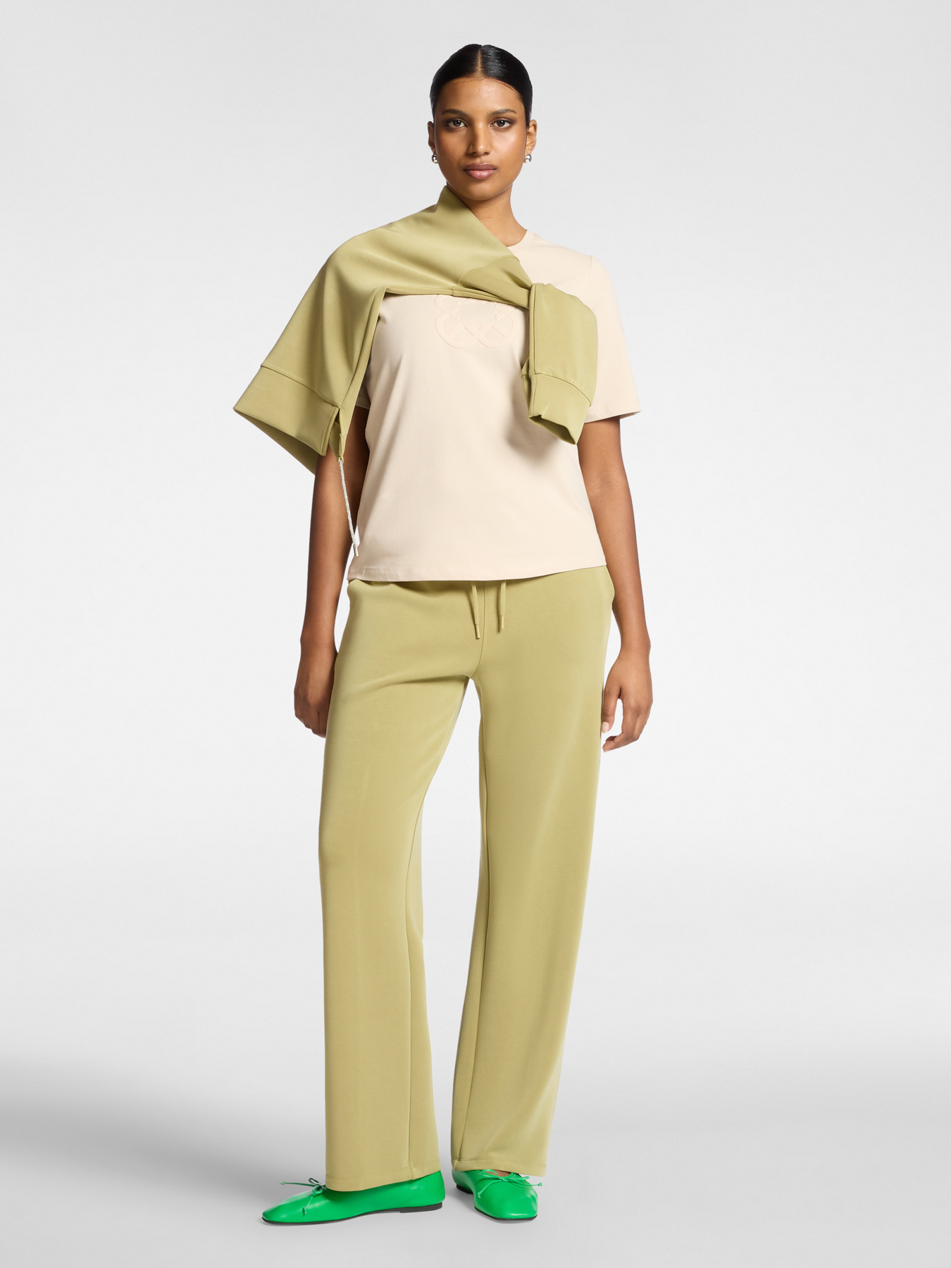 Футболка из эластичного хлопкового трикотажа. Короткий рукав, классический крой. Эмбосированная монограмма по центру изделия. Футболка прекрасно подходит в качестве нижнего слоя под кардиган или жакет.