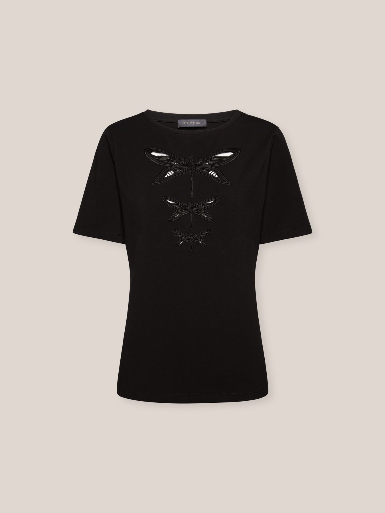 Футболка с короткими рукавами из эластичного хлопка. Горловина-лодочкой, ажурная вышивка в виде трех стрекоз. Одновременно базовое, но акцентное изделие. Идеальный и универсальный вариант для любого летнего наряда.