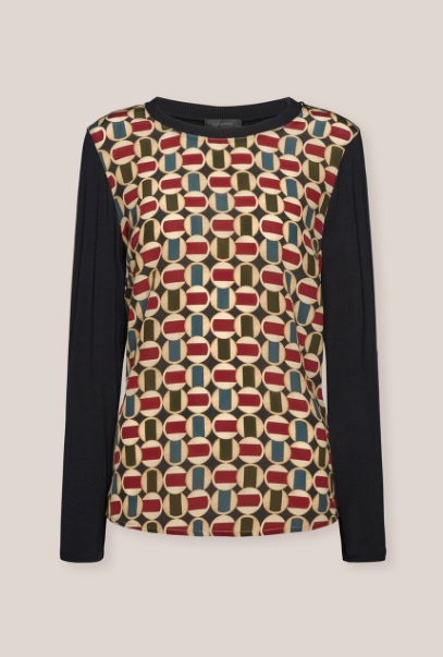 Базовая блузка из двух видов ткани – качественного трикотажа и 100% шелка с ярким принтом. Длинные рукава, круглый вырез, облегающий крой. Идеально сочетается с жакетом. Элегантное и универсальное изделие на каждый день.