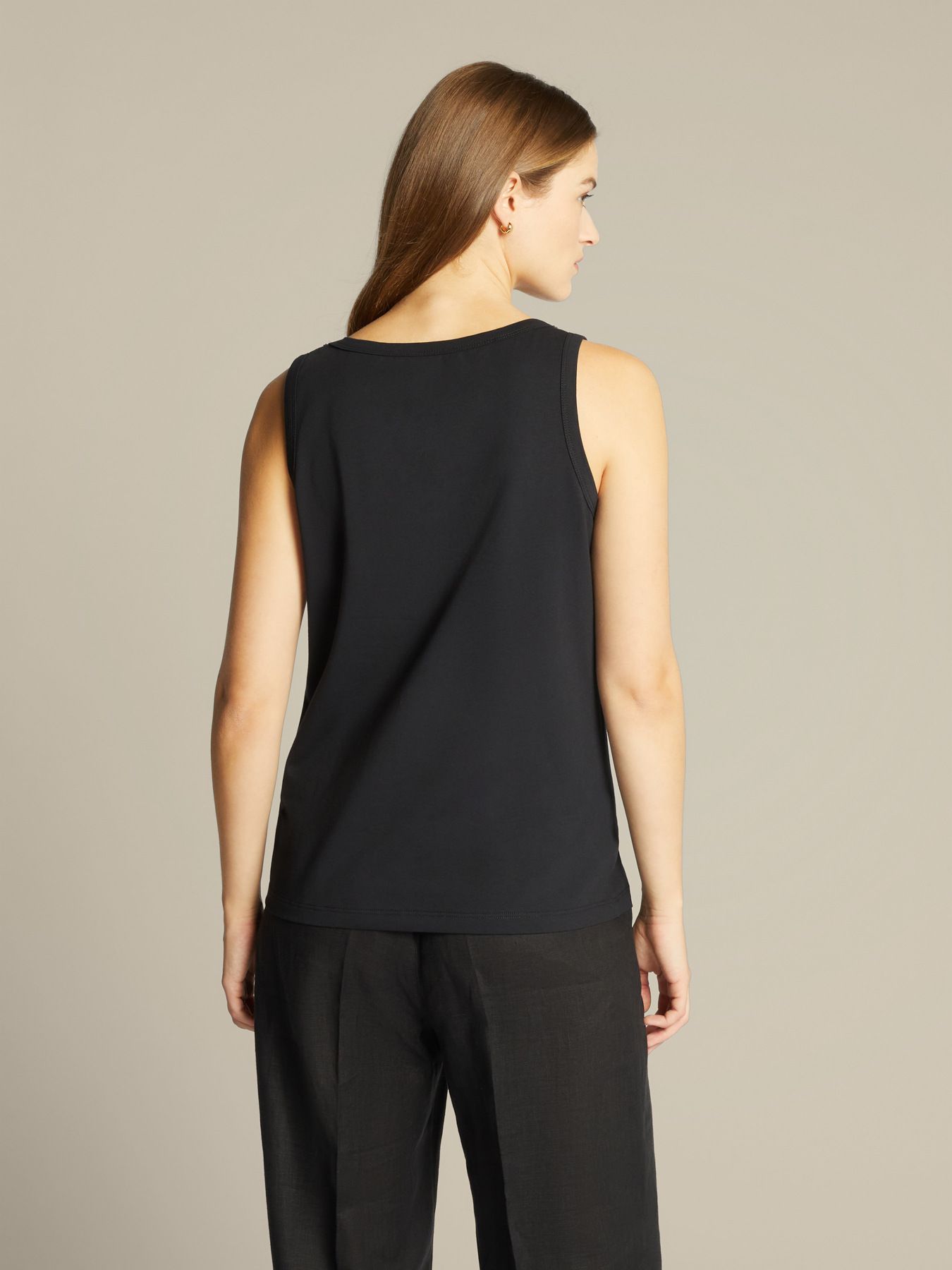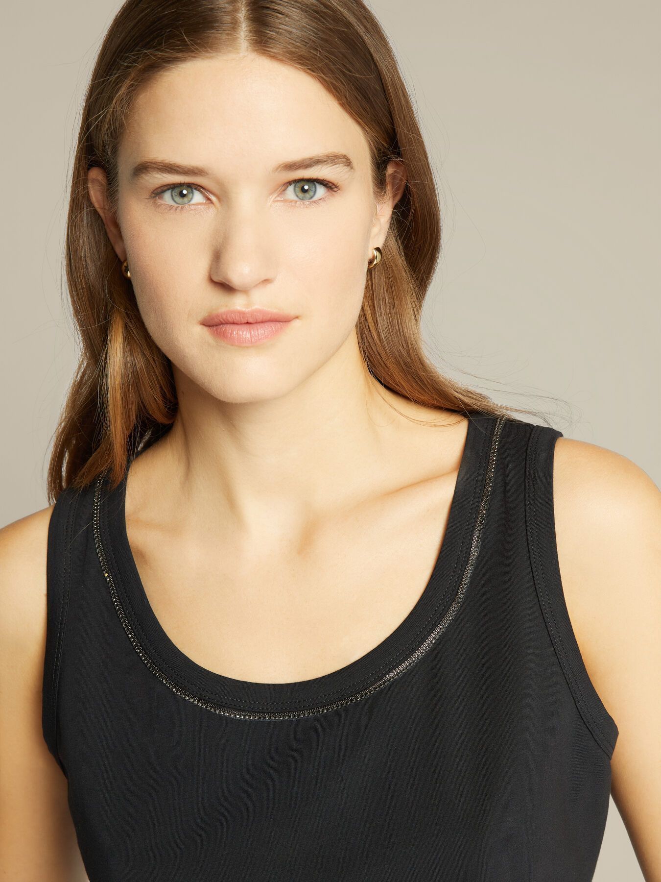 Хлопковый топ-безрукавка с акцентной деталью из страз вдоль выреза. Приталенный крой, облегающий силуэт - будет прекрасно смотреться в комплекте с пиджаком.