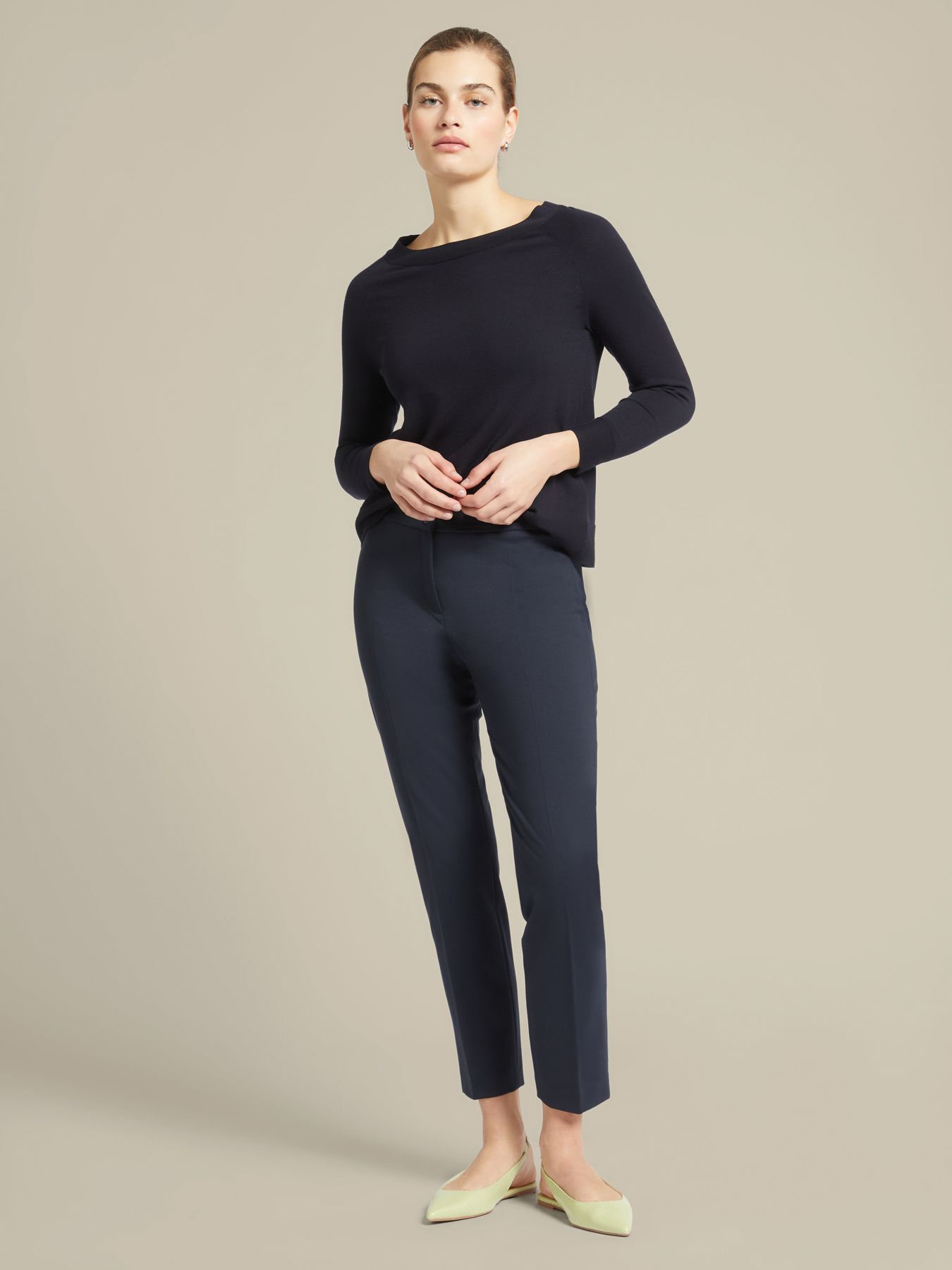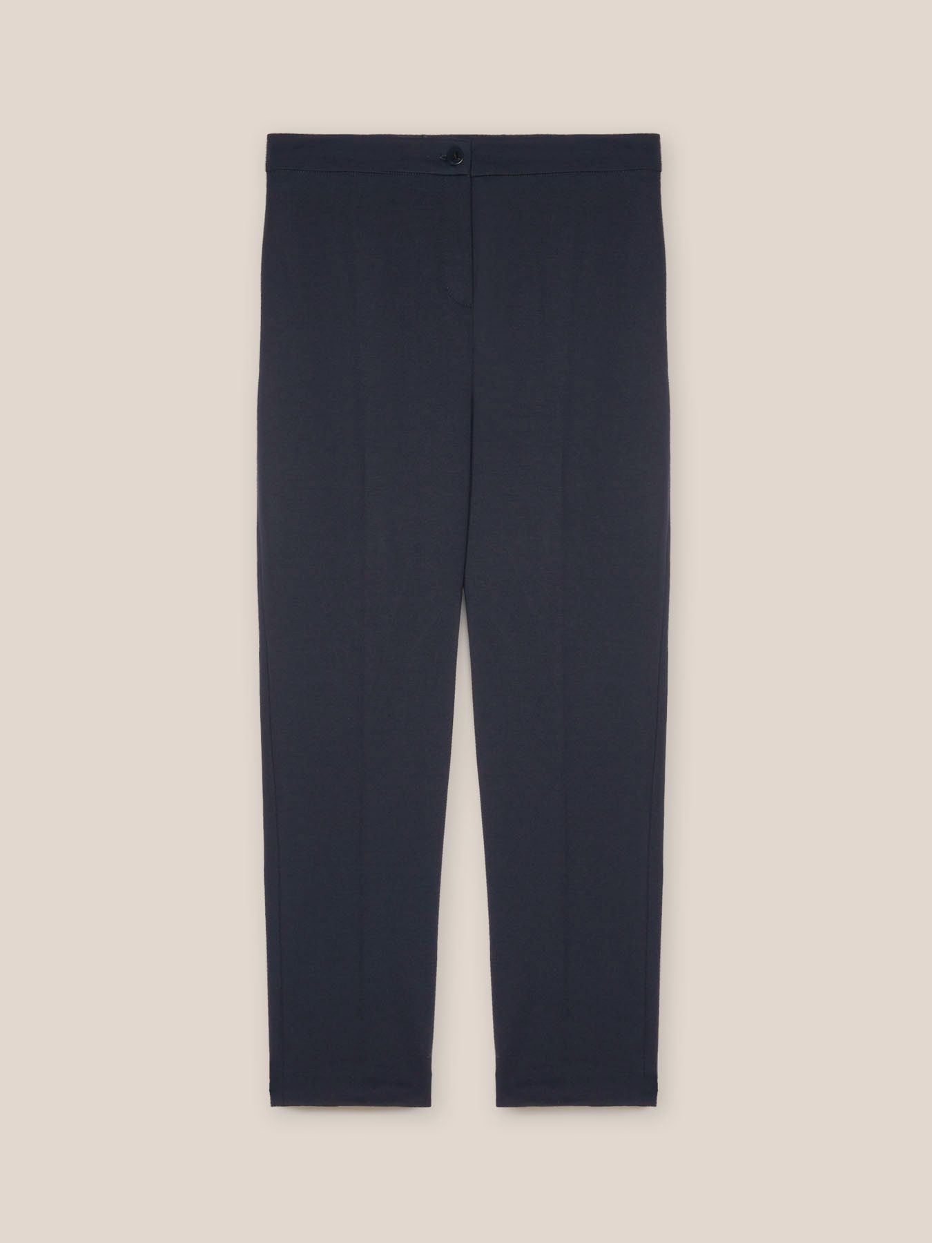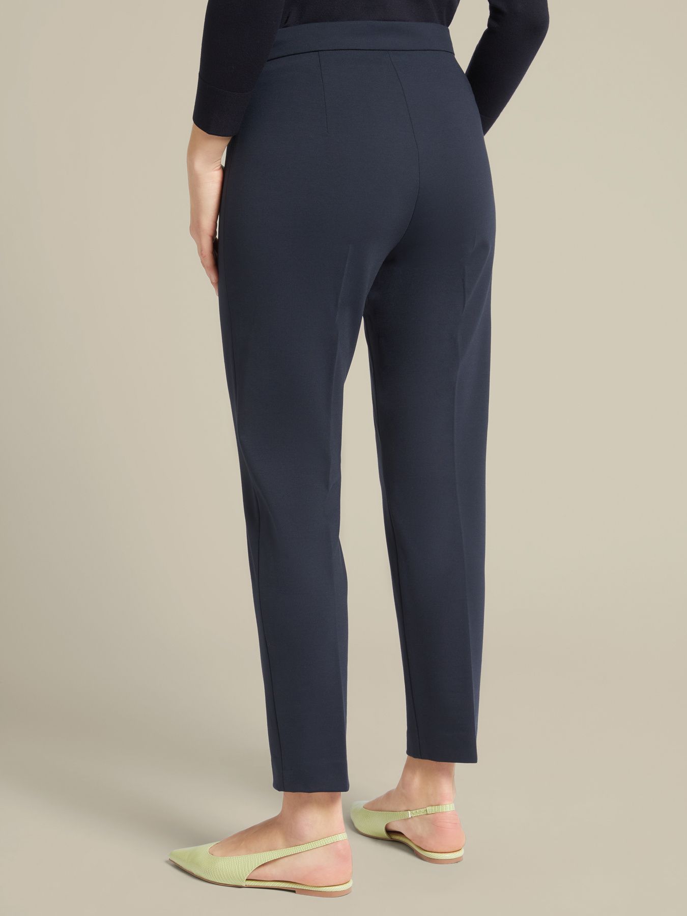 Классические зауженные брюки из эластичной вискозы Punto Milano. Стандартная линия талии, эластичный пояс, застегиваются на молнию и пуговицу. Прекрасно подходят как для повседневного образа, так и для комфортного вечернего выхода. Размер на модели: 46 RUS (44 IT) Параметры модели: рост 178 см, грудь 92 см, талия 66 см, бедра 101 см.