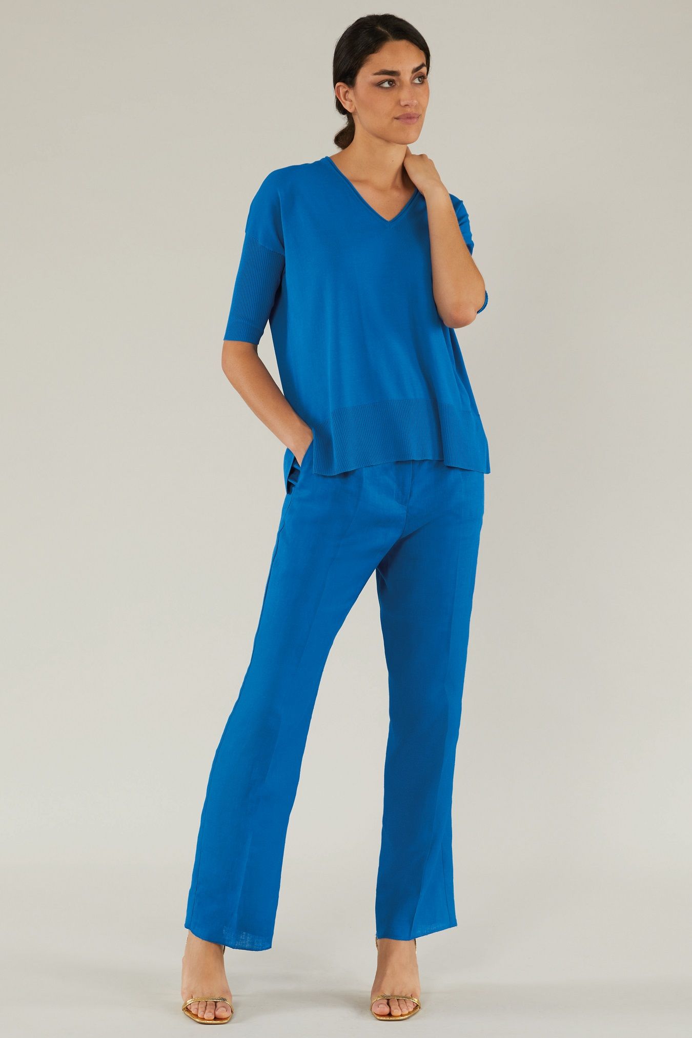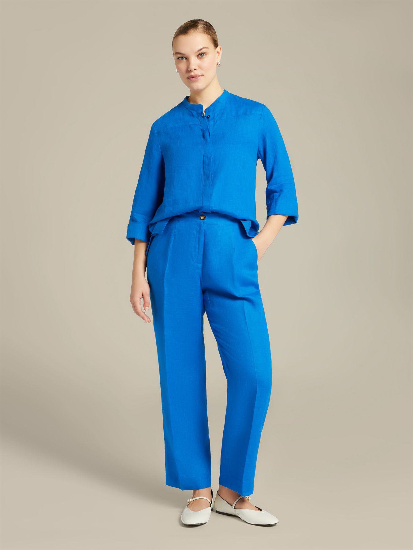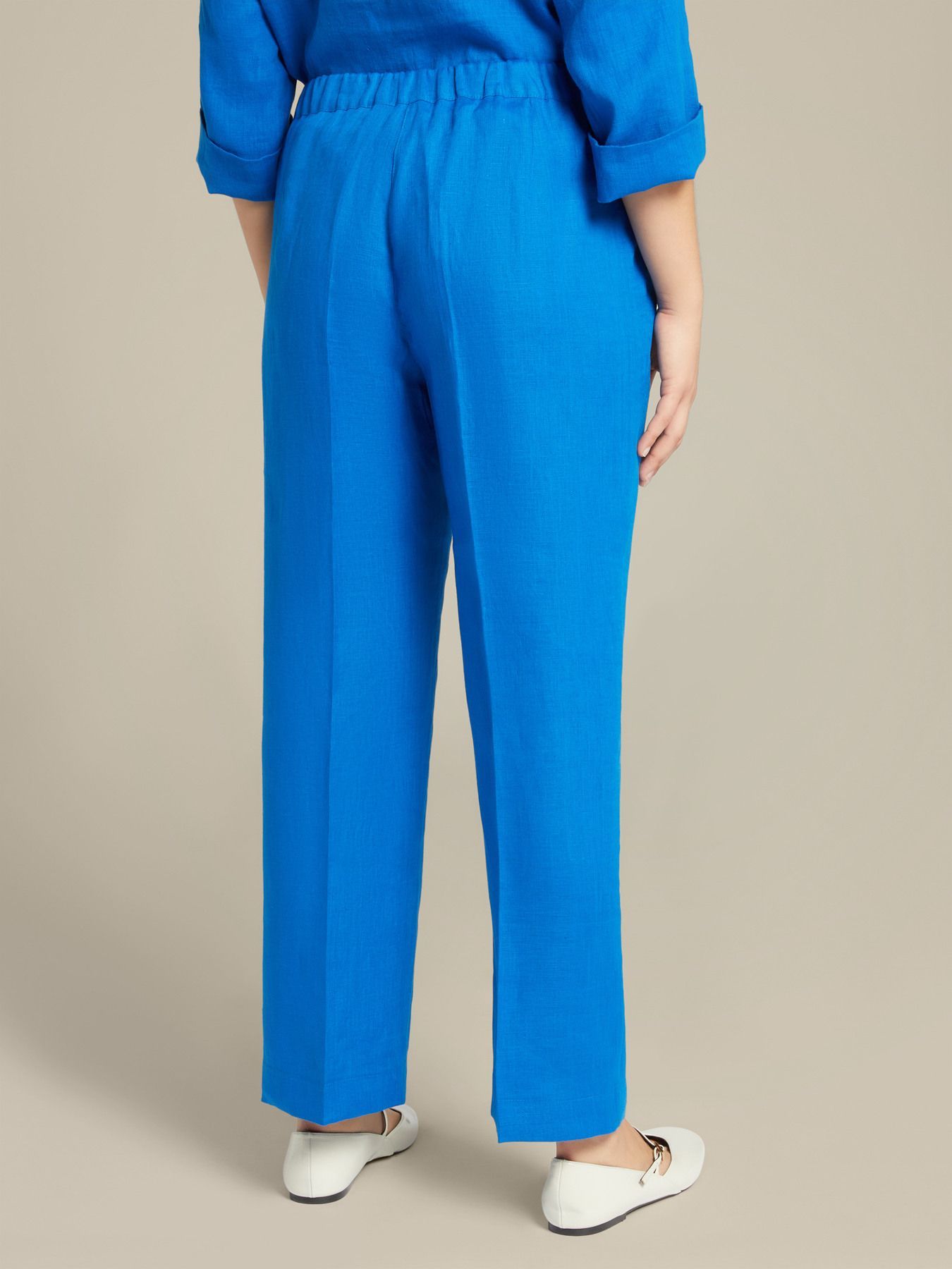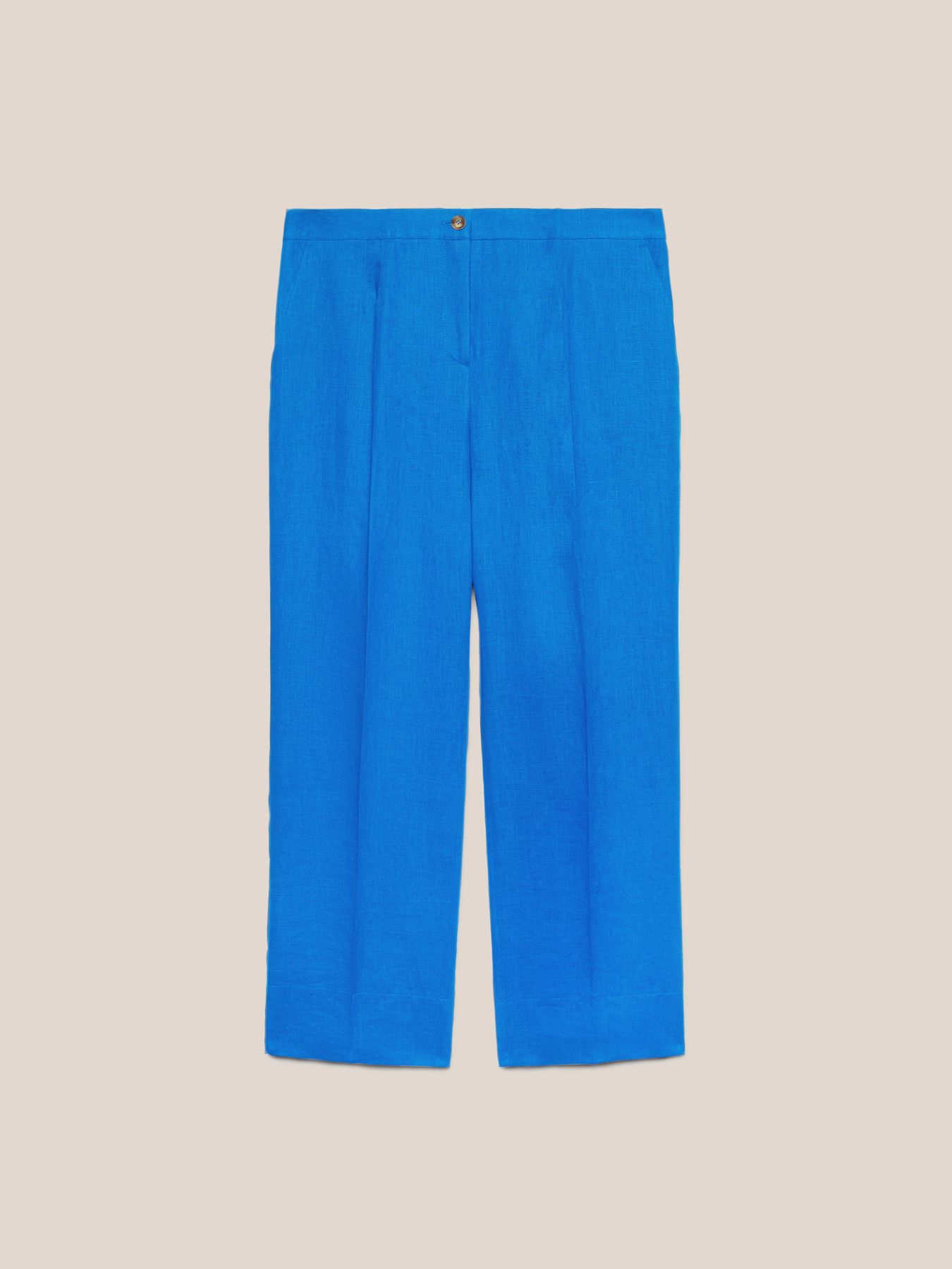 Изысканные брюки из чистого льна. Прямой крой, стандартная линия талии, пояс с внутренней резинкой сзади, косые карманы, эффектные стрелки спереди, застегиваются на молнию и пуговицу. Идеально подходят для комфортного неформального современного образа.