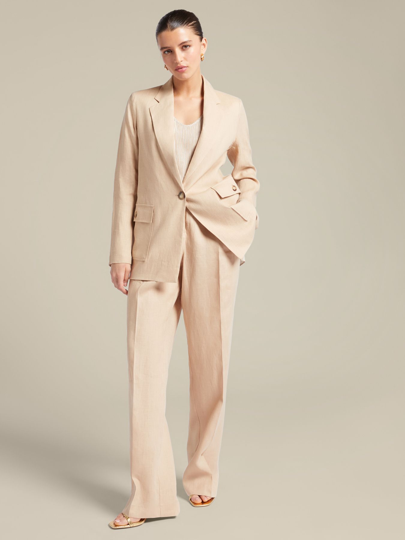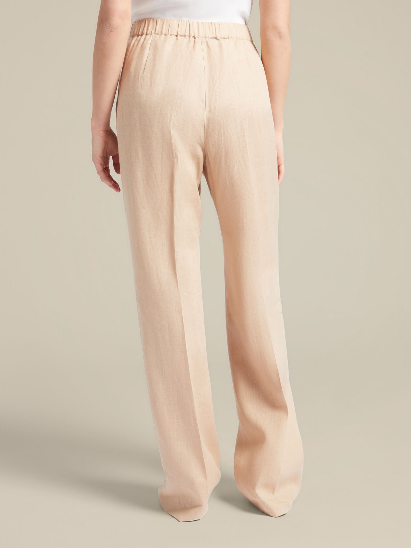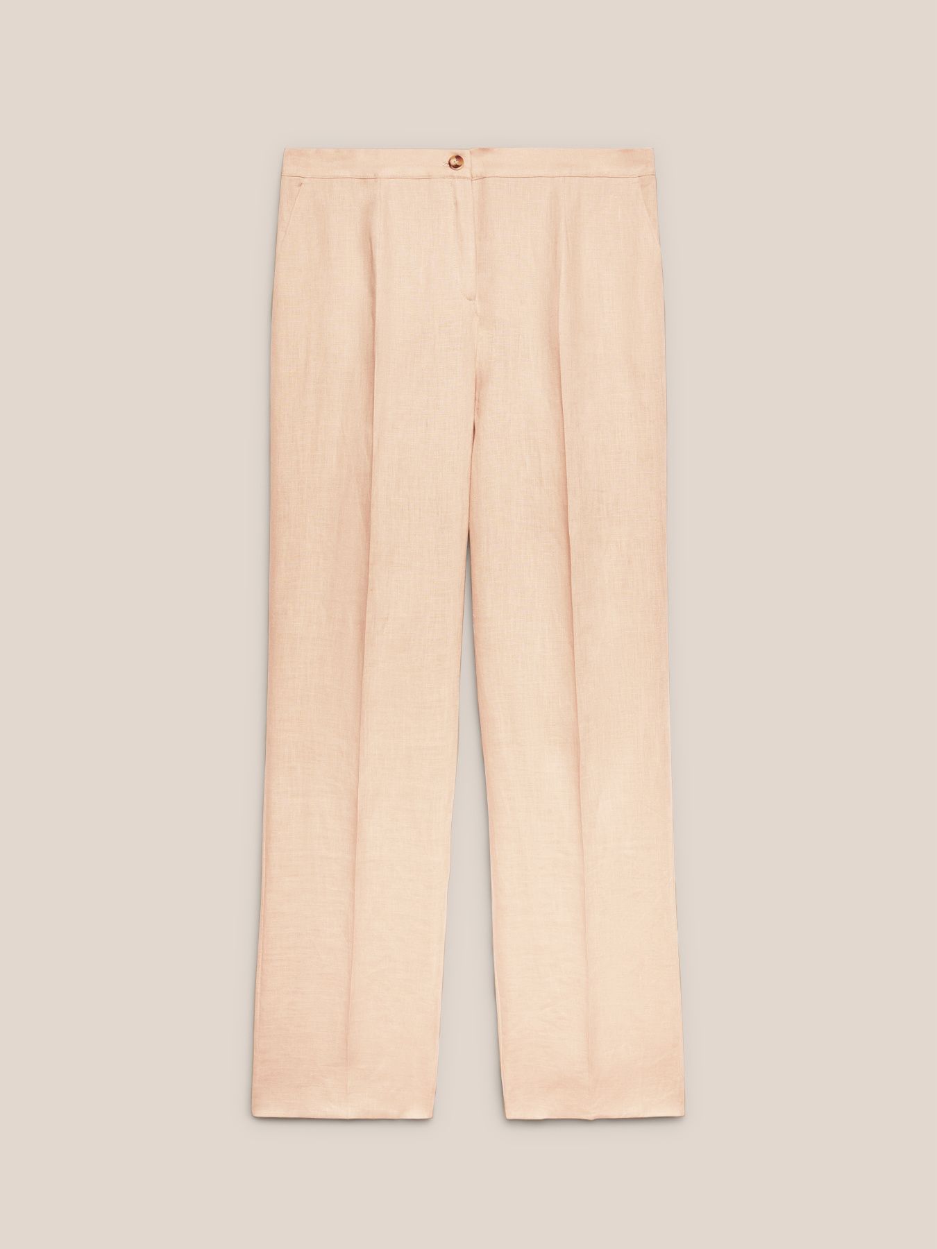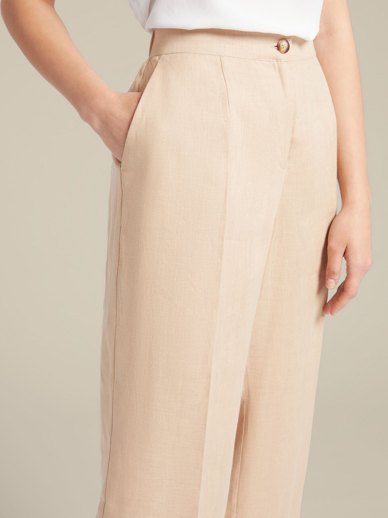 Изысканные брюки из чистого льна. Прямой крой, стандартная линия талии, пояс с внутренней резинкой сзади, косые карманы, эффектные стрелки спереди, застегиваются на молнию и пуговицу. Идеально подходят как для комфортного повседневного образа, так и для особенных случаев.