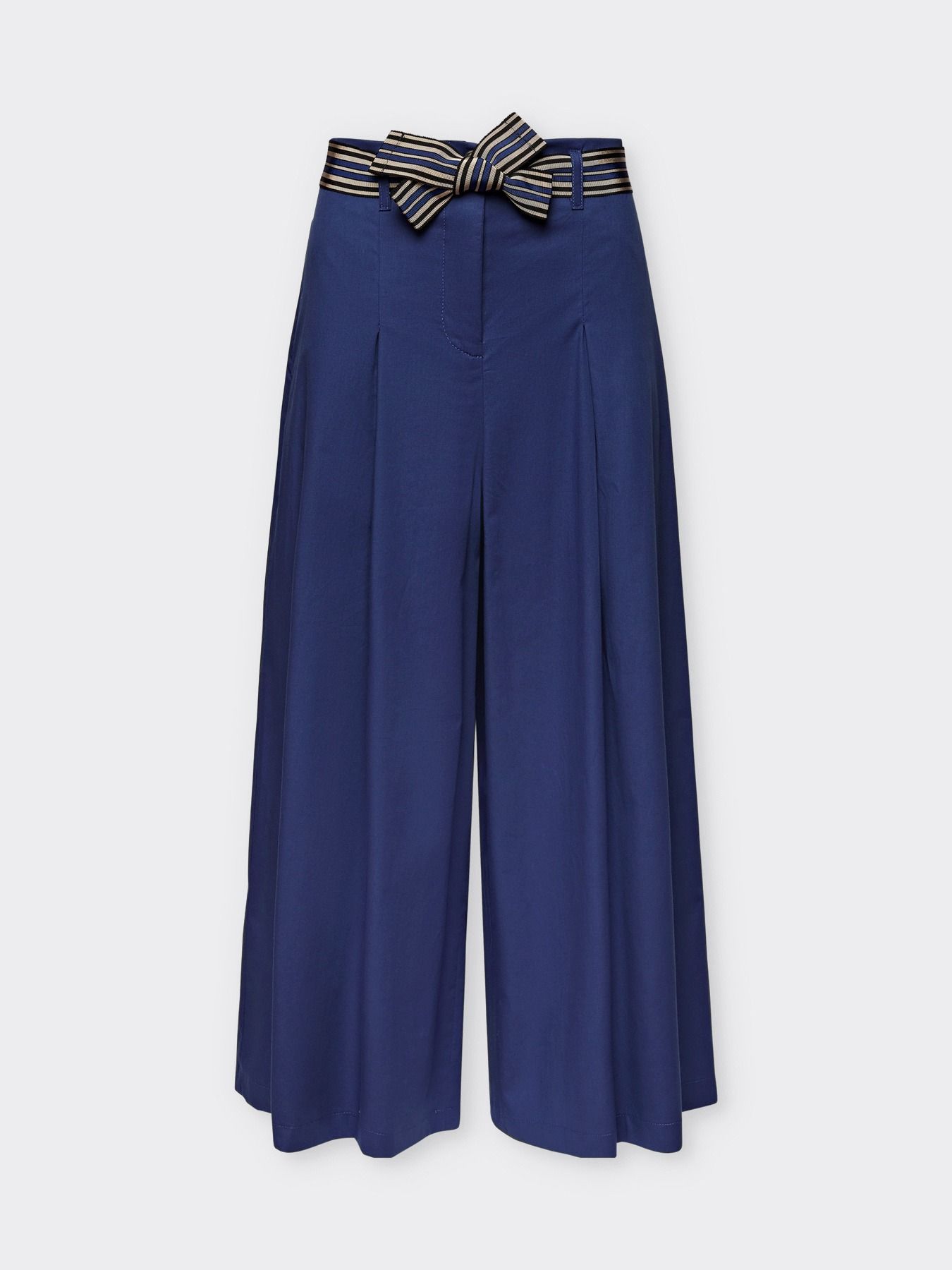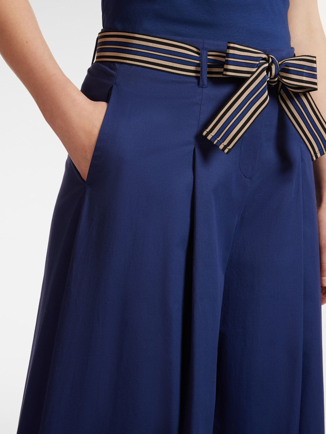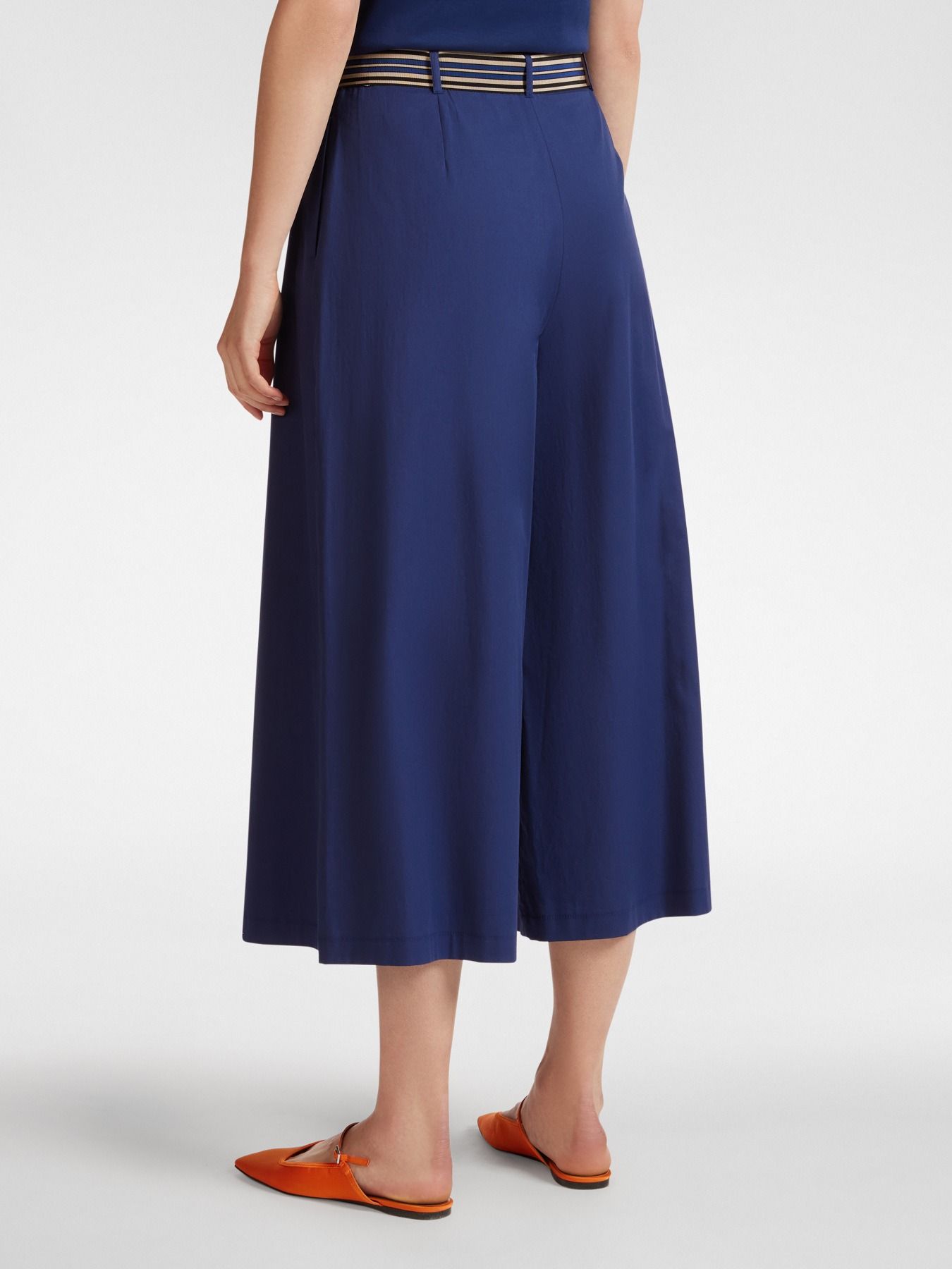 Брюки-кюлоты из эластичного переработанного хлопка. Расклешённые брючины и защипы на бёдрах создают эффект юбки со складками. Пояс с полосатым узором подчеркивает линию талии и придает образу утонченность.