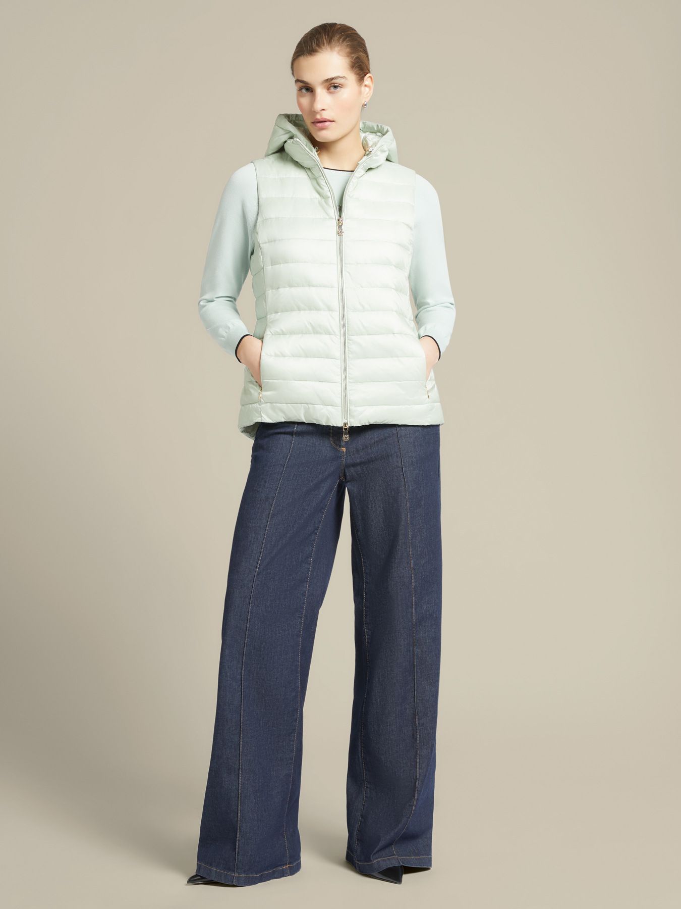 Стеганый жилет из 100% переработанного нейлона. Регулируемая кулиска, закругленный низ, съемный капюшон, застегивается на молнию. Модель изготовлена из ветрозащитного, непромокаемого материала. Размер на модели: 46 RUS (44 IT) Параметры модели: рост 178 см, грудь 92 см, талия 66 см, бедра 101 см.
