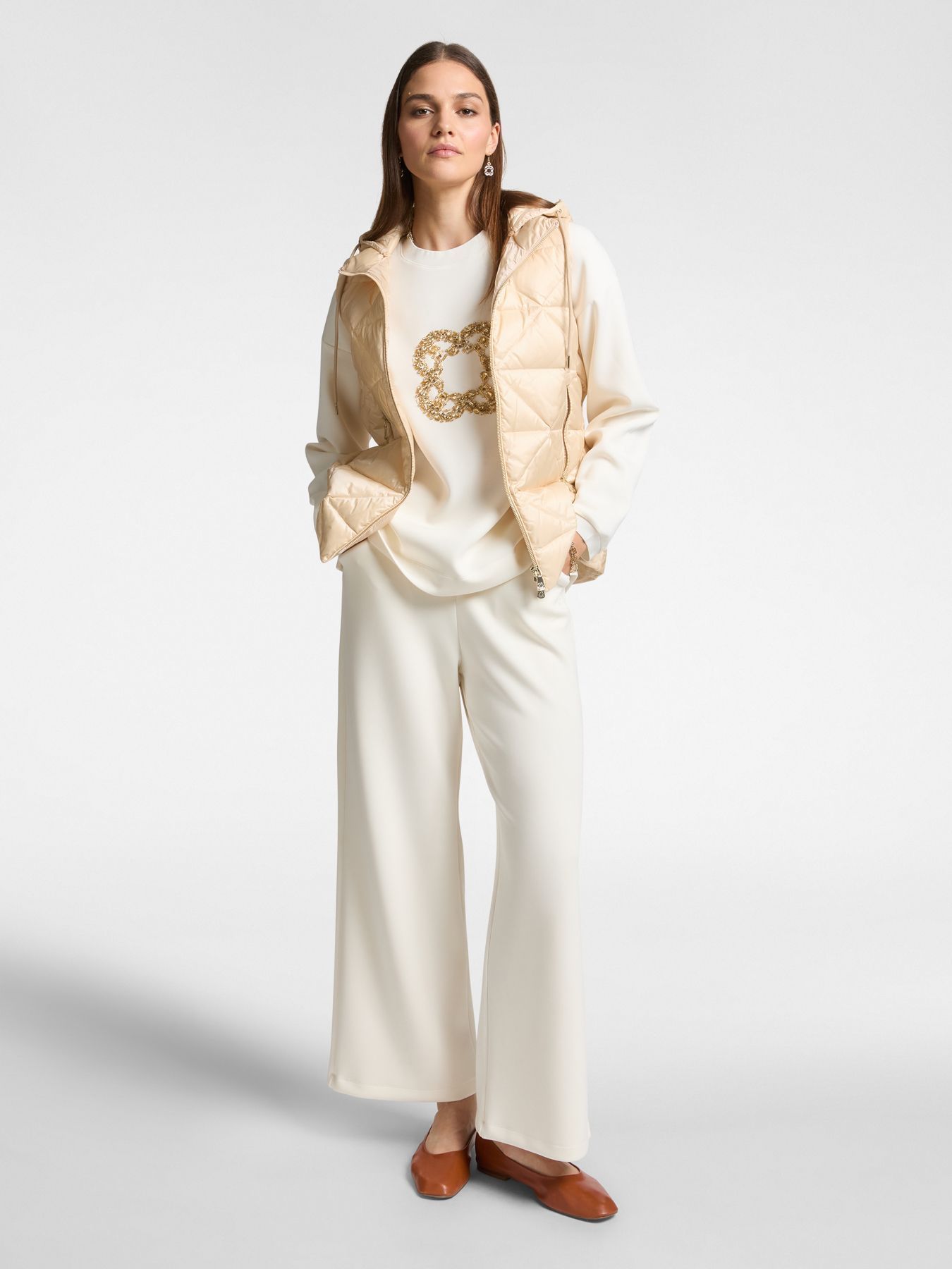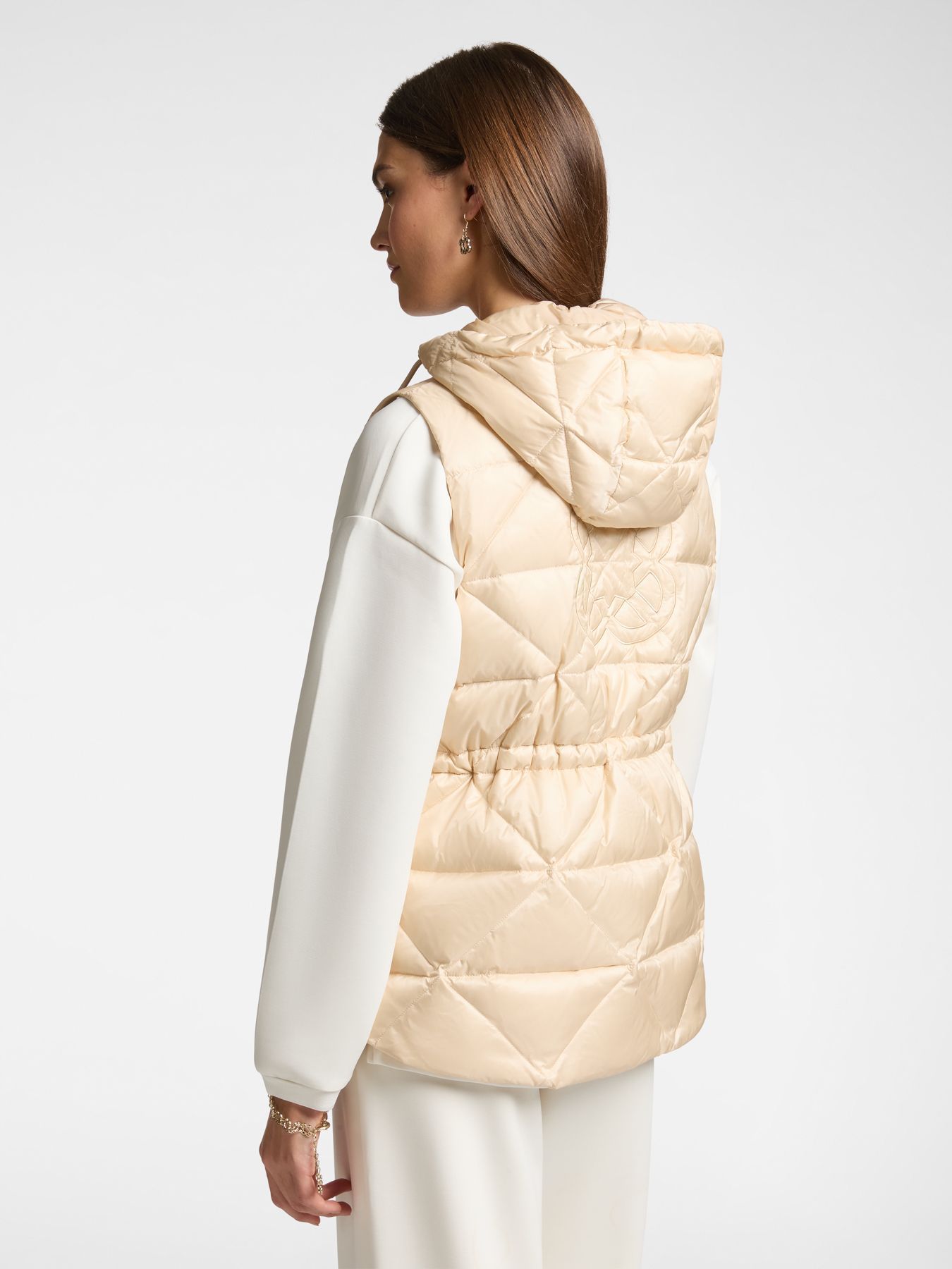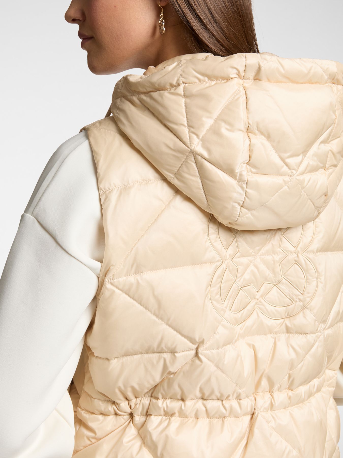 Ультра легкий стеганный жилет с пуховым наполнителем из нейлона с съемным капюшоном и карманами на молнии завершит ваш образ в стиле спорт шик. На спине дизайнер добавила монограмму бренда. Кулиска на талии по спинке изделия добавит удобства в посадке и подчеркнет вашу женственность.