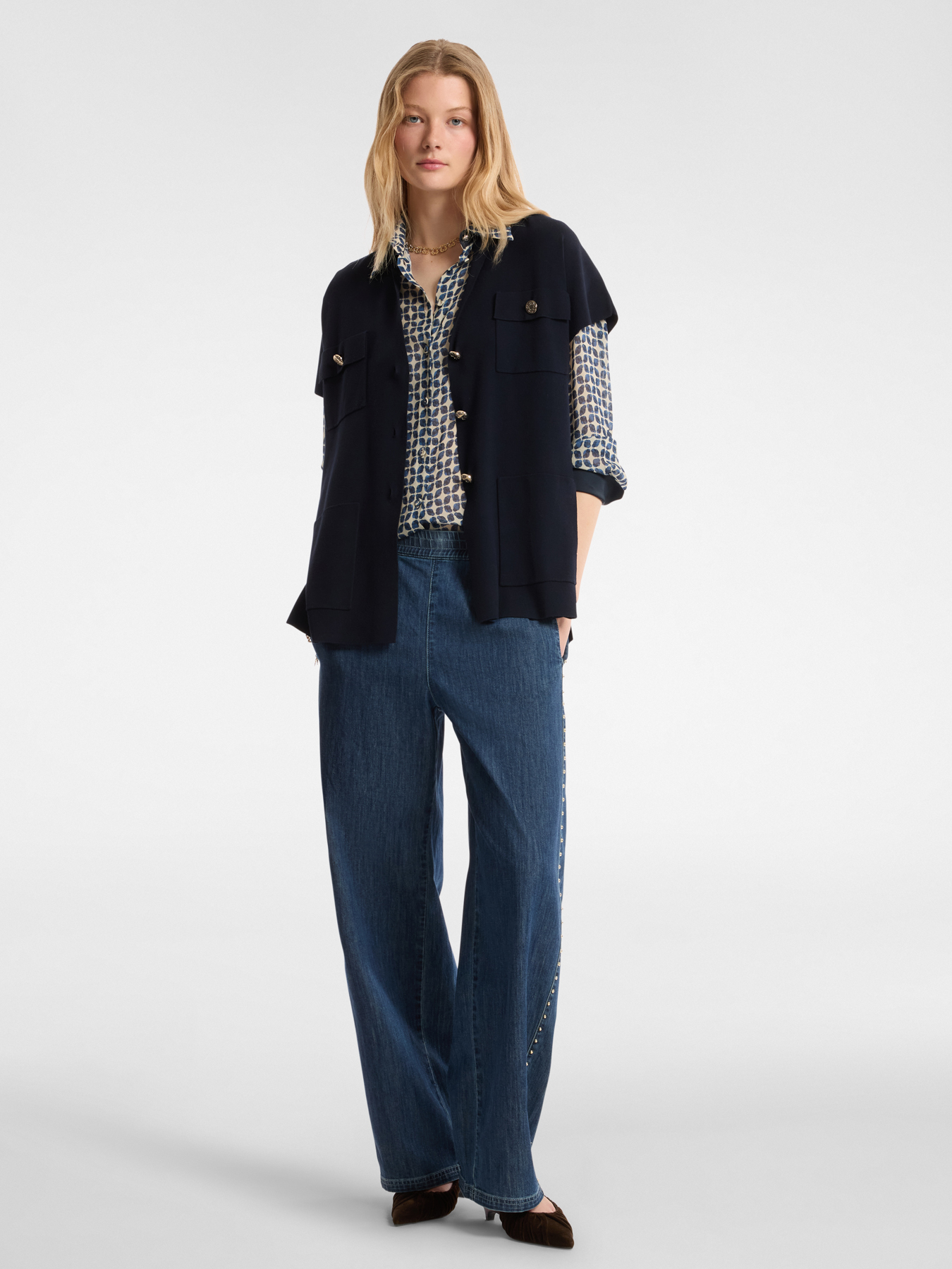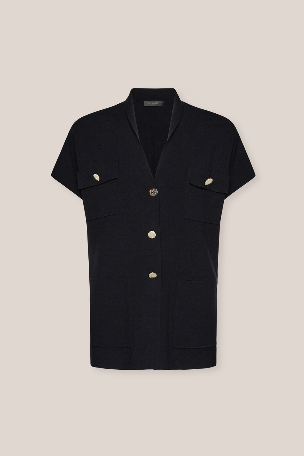 Кардиган с короткими рукавами, воротником шалью, накладными карманами и небольшими пуговицами с монограммой. Изготовлено из мягкой, но плотной пряжи из вискозы. Уникальное и элегантное изделие для повседневных образов.