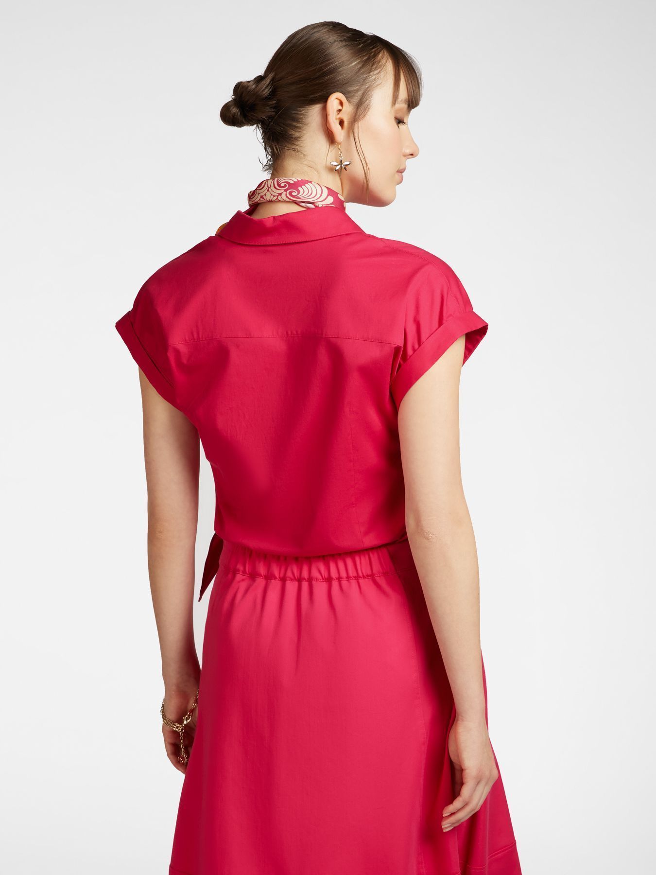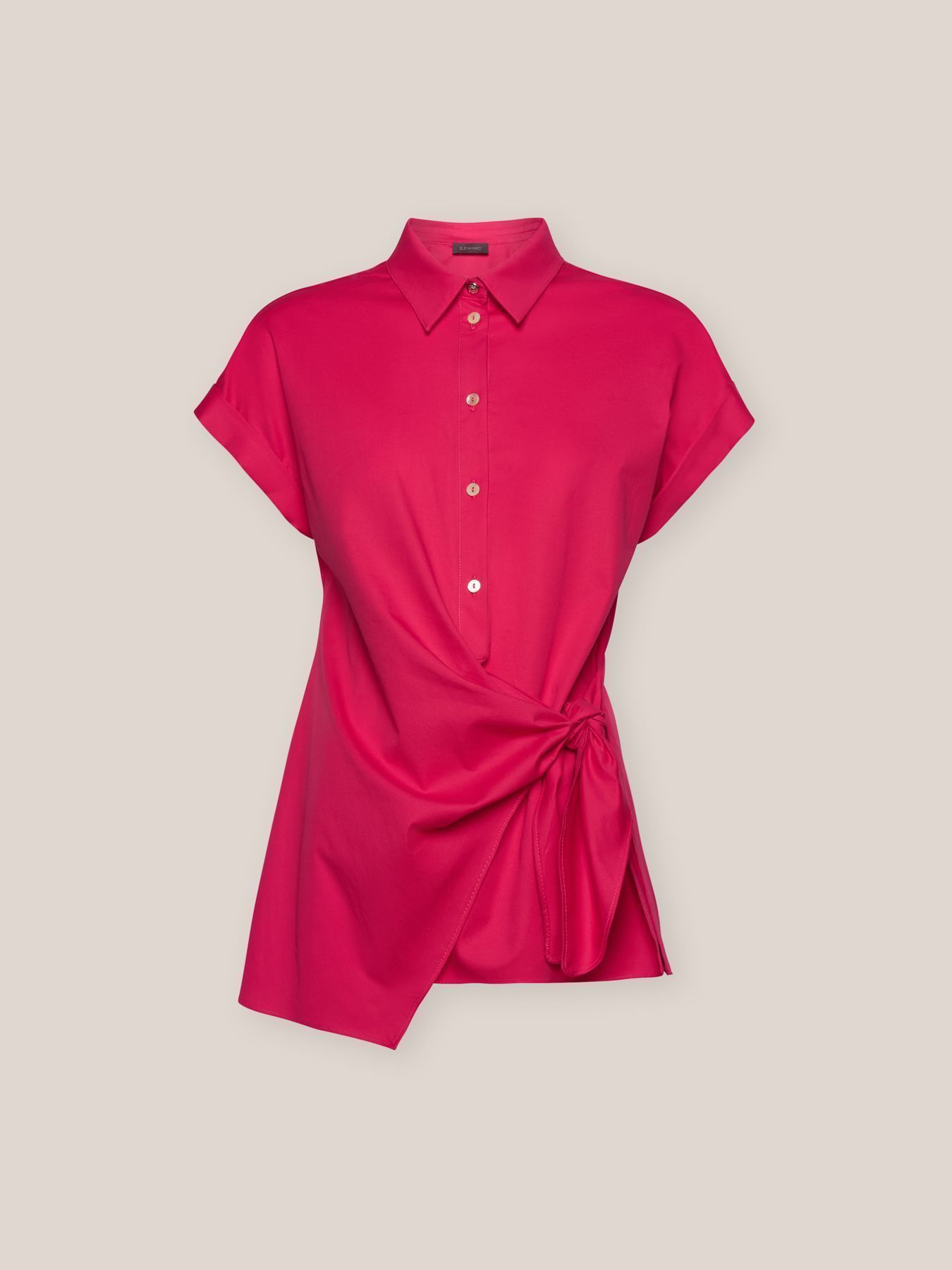 Блузка из эластичного хлопка с короткими рукавами. Утонченный стиль, рукав кимоно, яркая деталь в виде узла. Идеально подходит для современного повседневного образа, в том числе в офис.