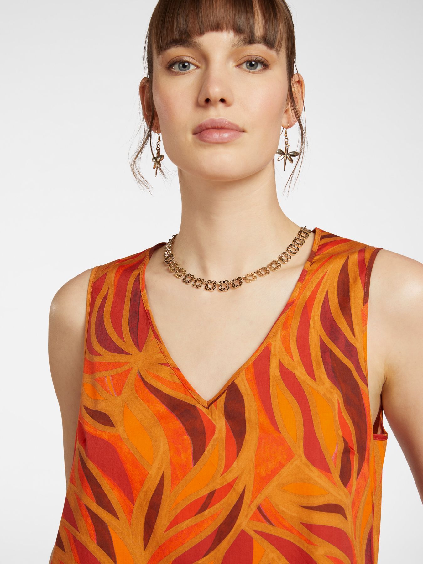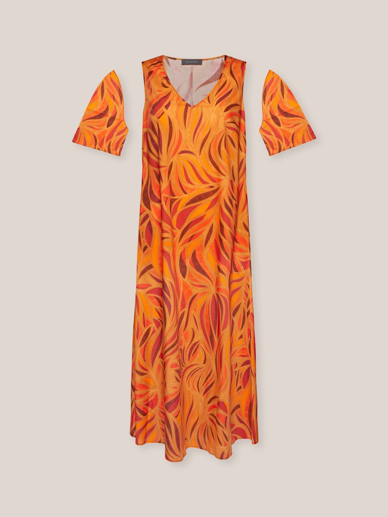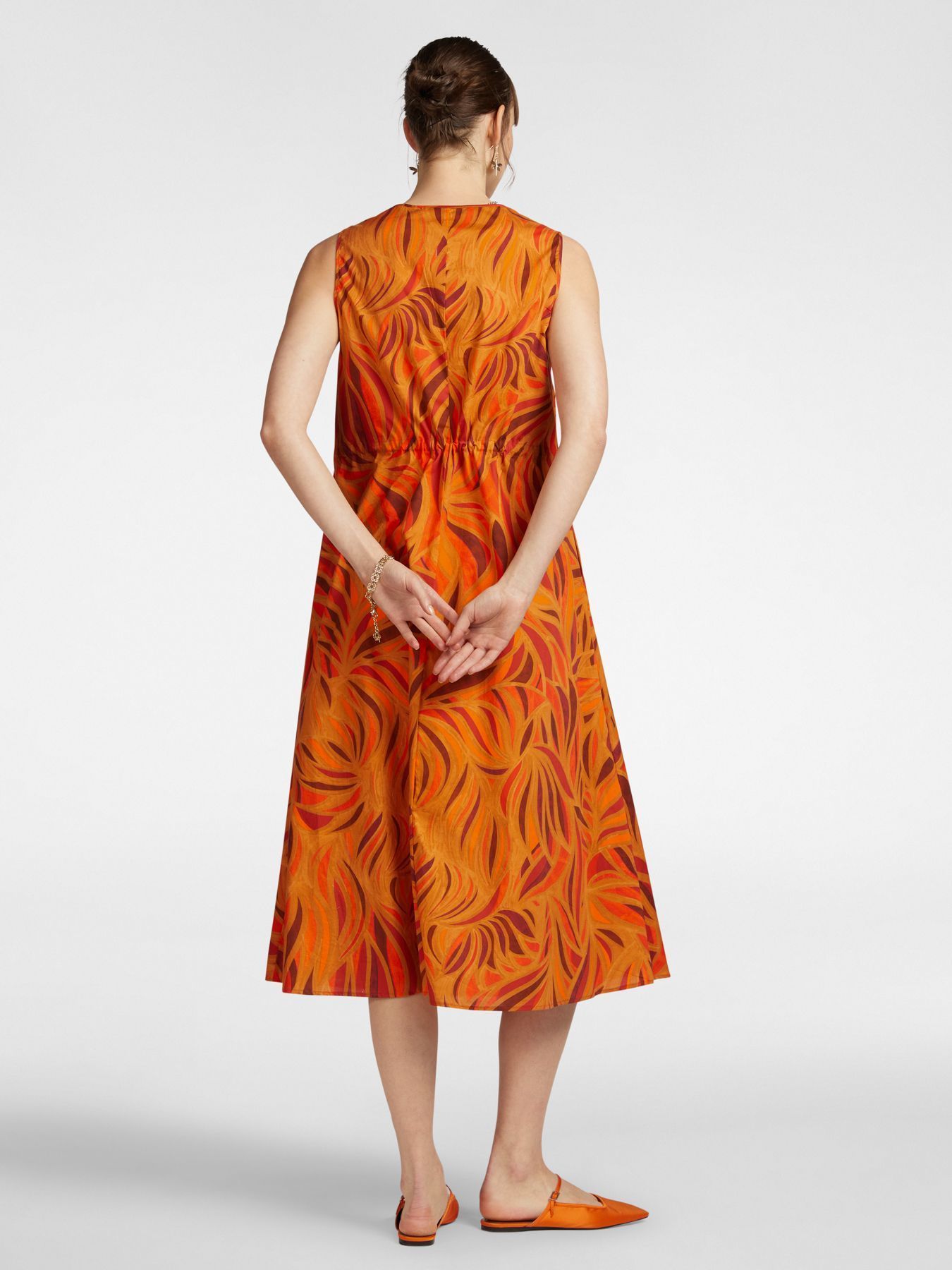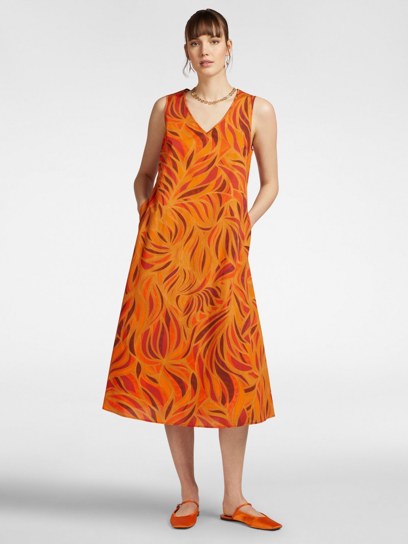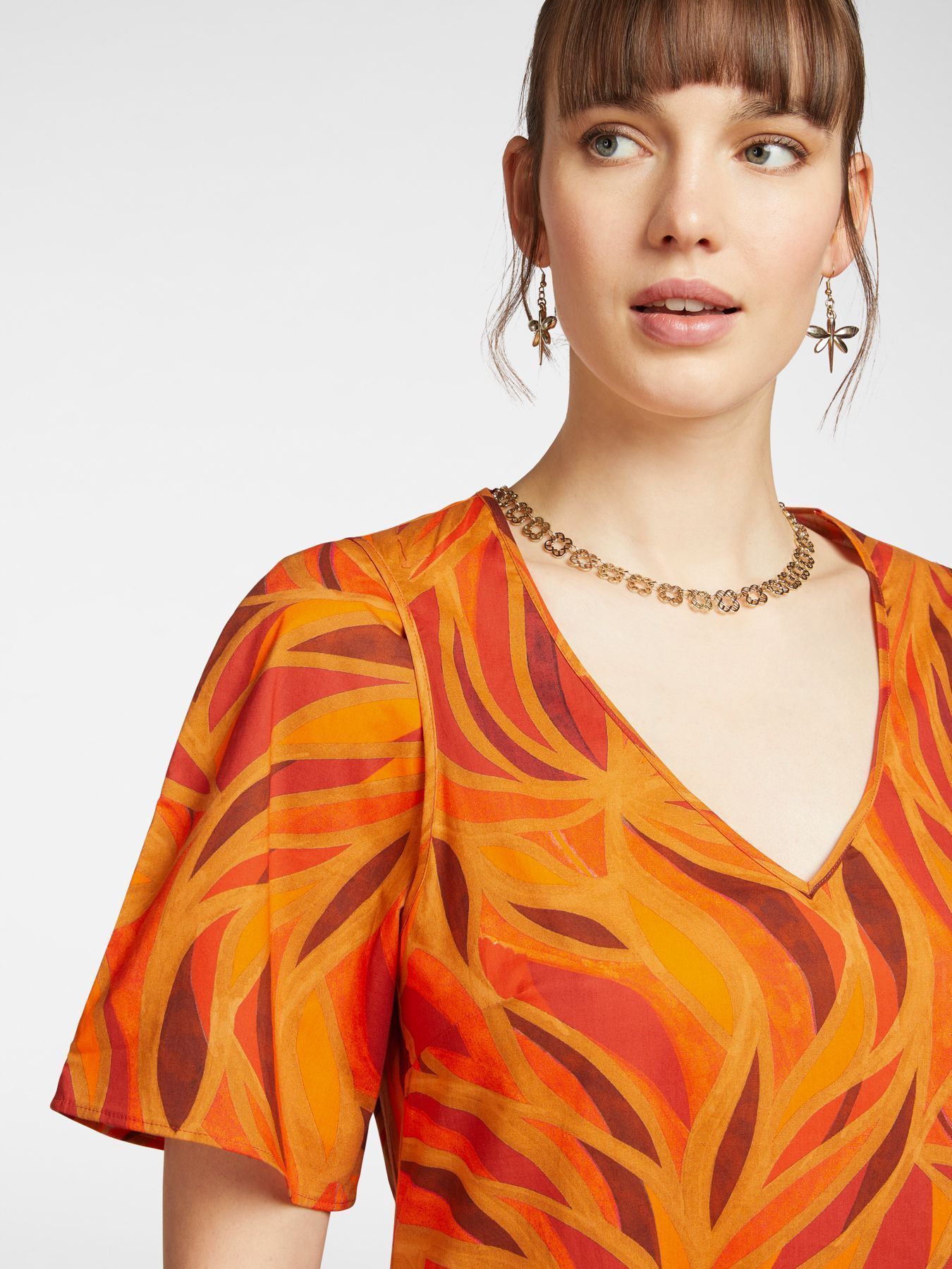 Платье-миди из эластичного хлопка. V-образный вырез, пришивные рукава, акцентный принт, расклешенный крой. Идеальное летнее платье на каждый день.