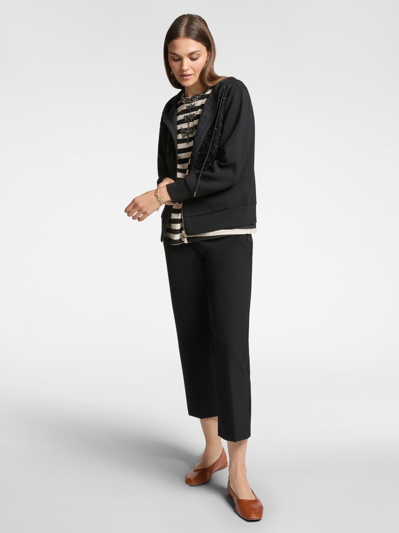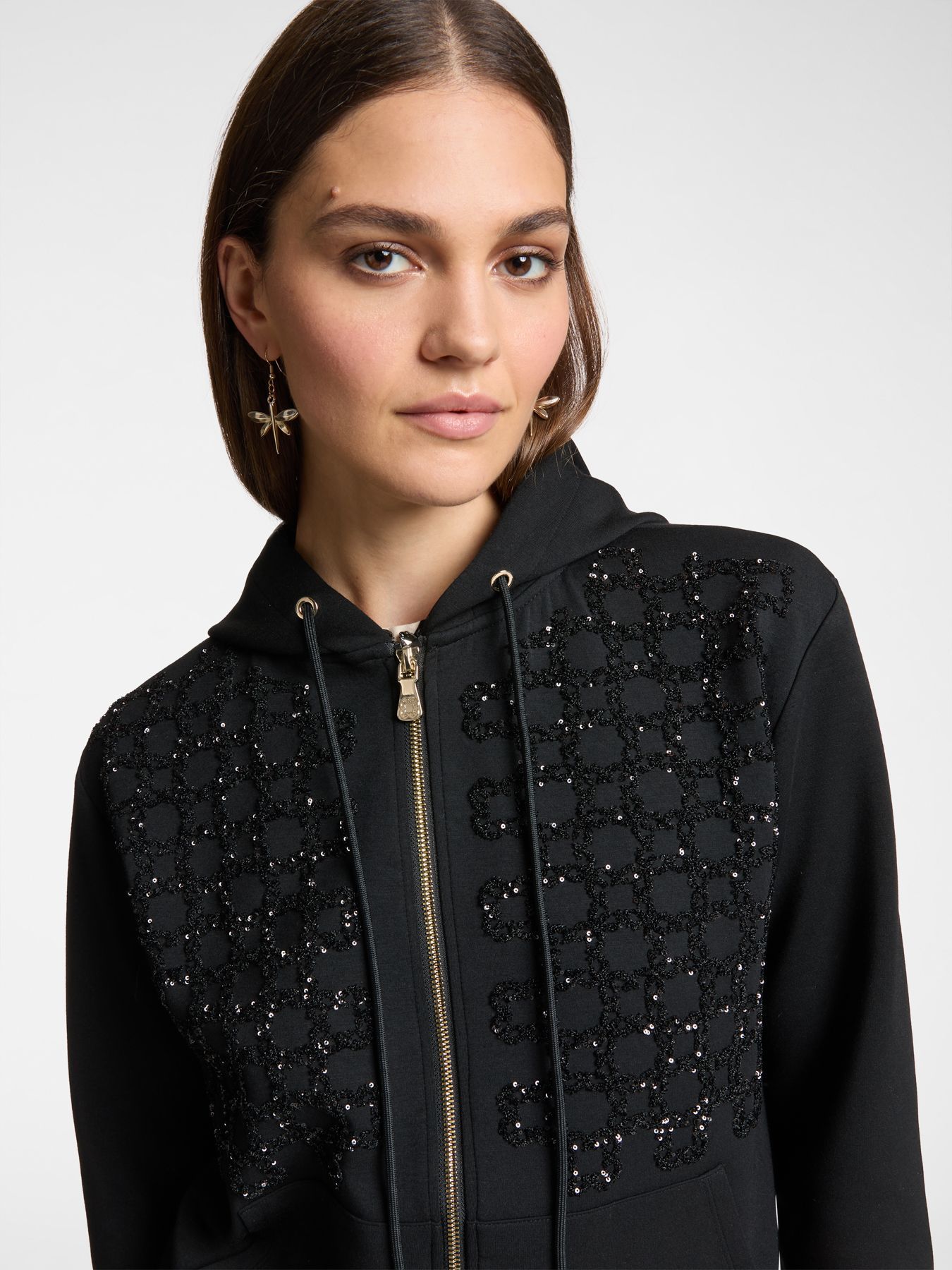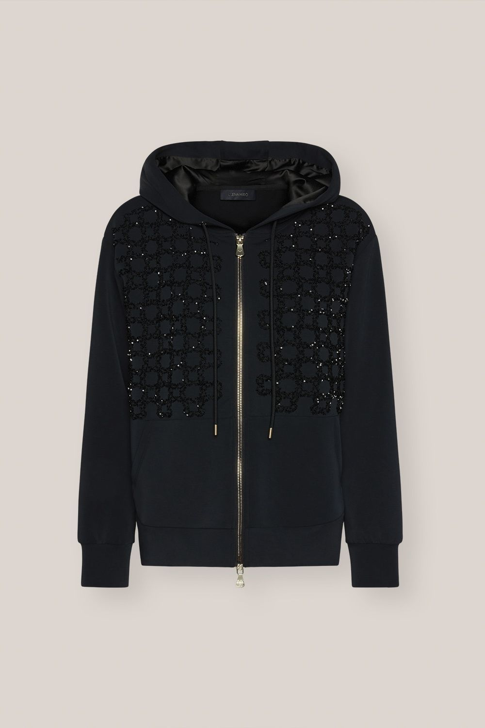 Для создания худи с длинными рукавами дизайнер бренда взяла инновационную ткань скуба. Скуба изготовлена из модала. Изделие украшает вышивка в виде монограммы бренда.