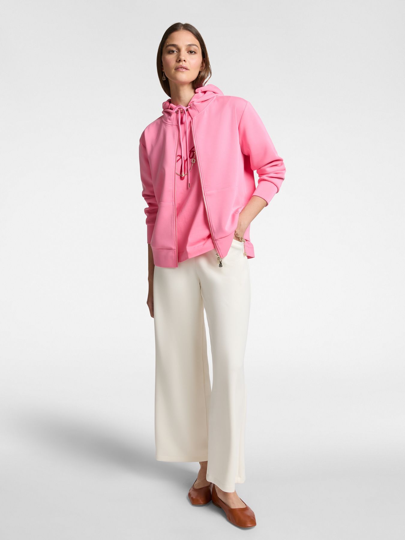 Для создания худи с длинными рукавами дизайнер бренда взяла инновационную ткань скуба. Скуба изготовлена из модала. Изделие украшает вышивка в виде монограммы бренда.