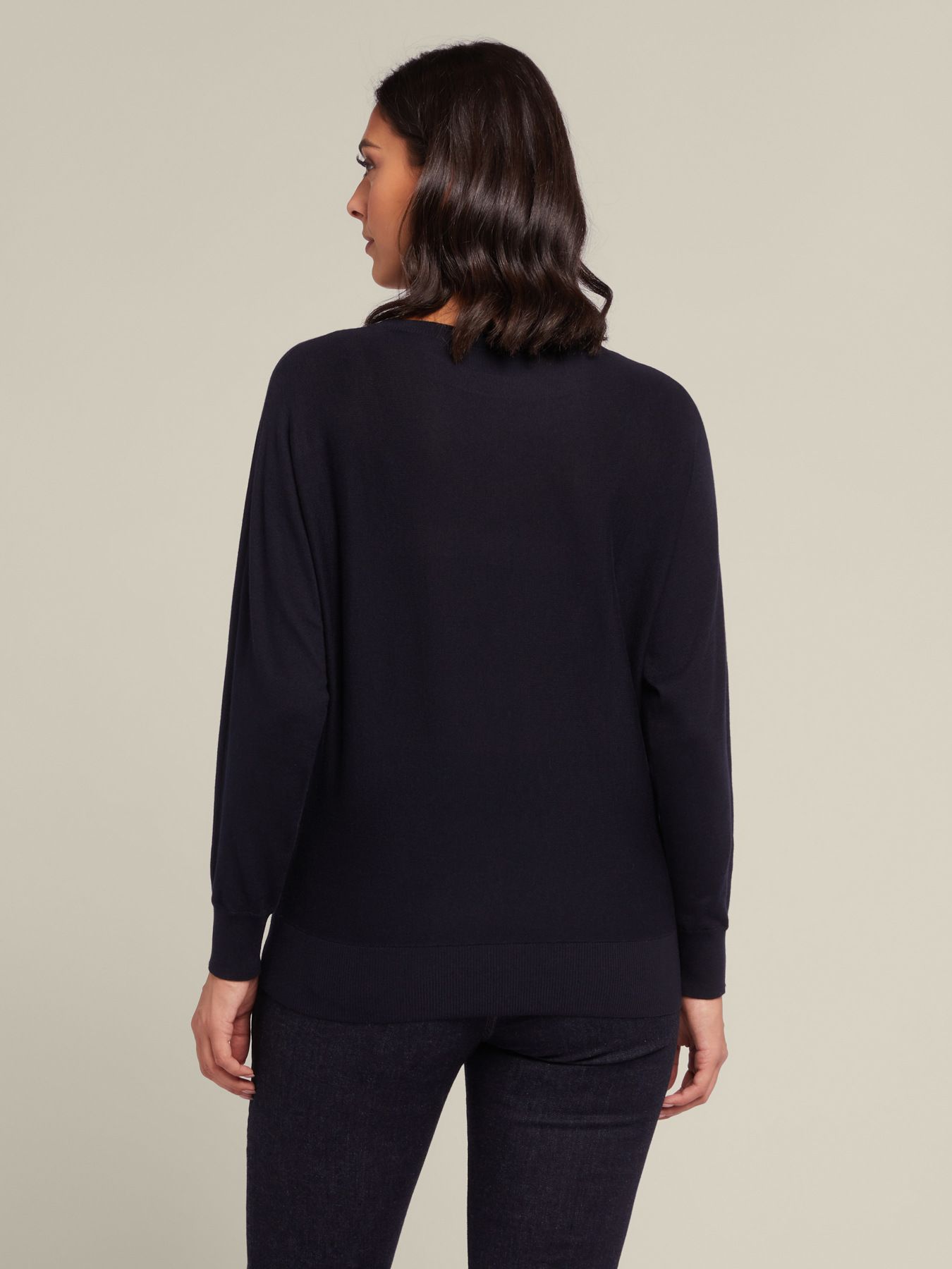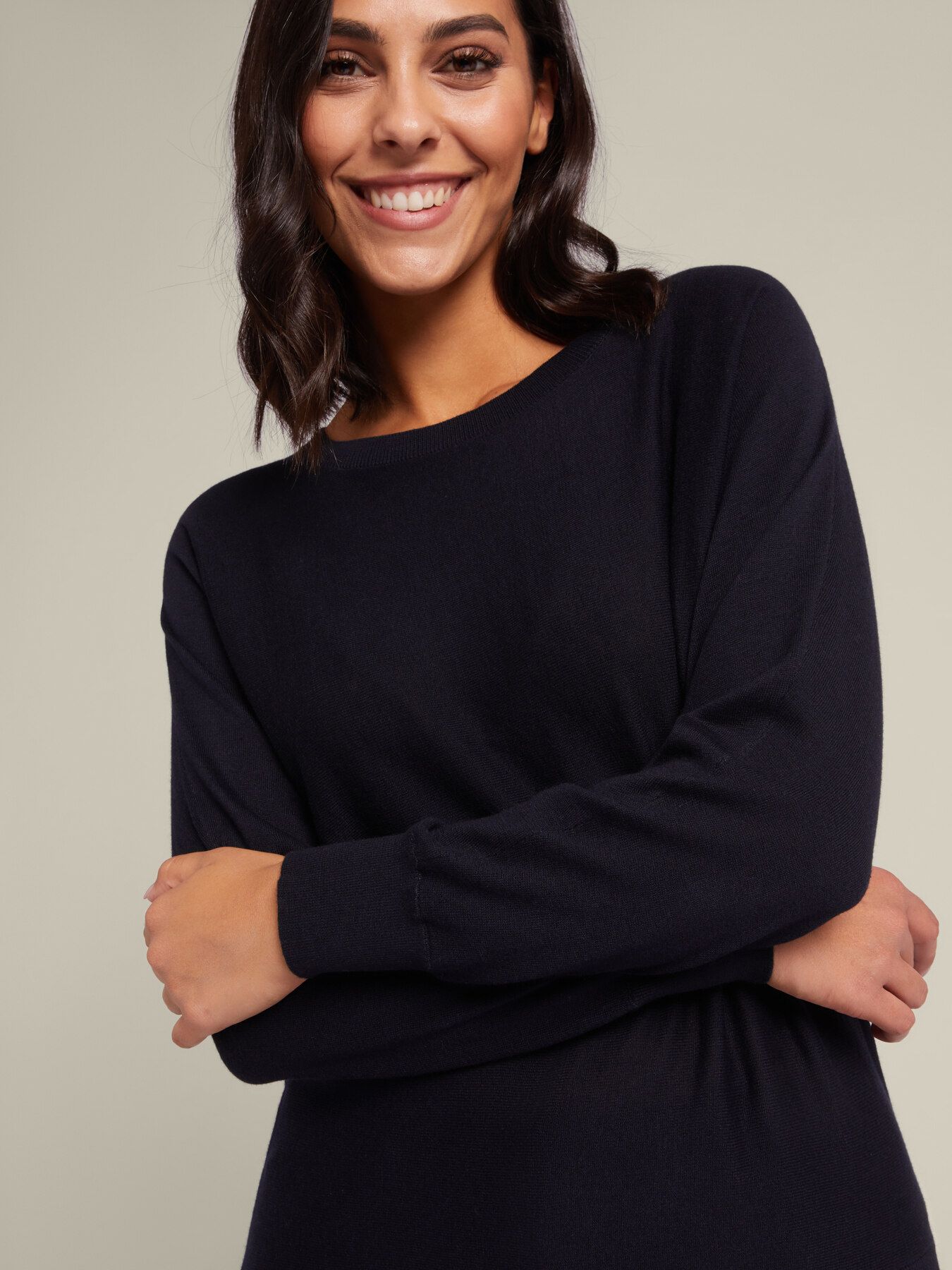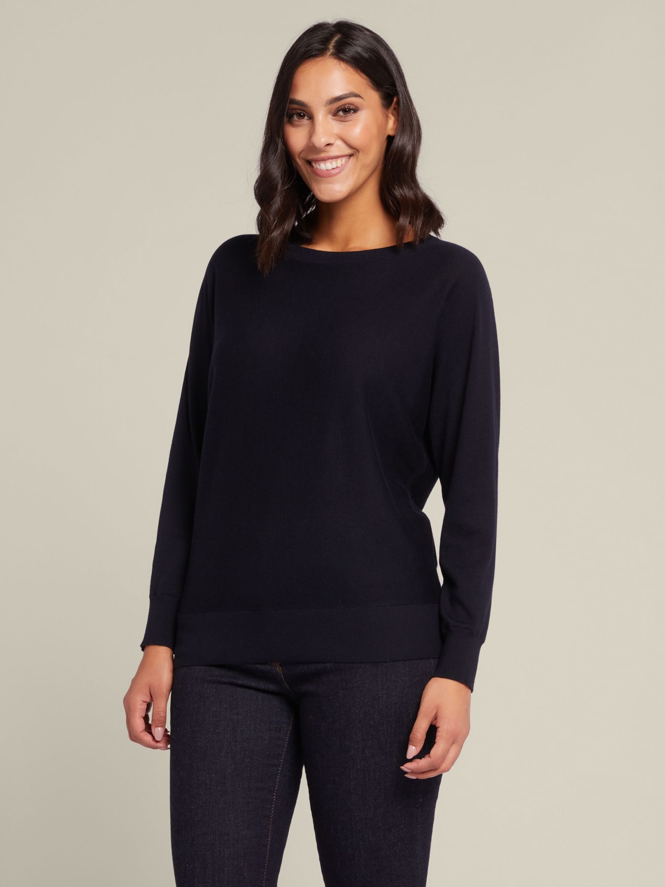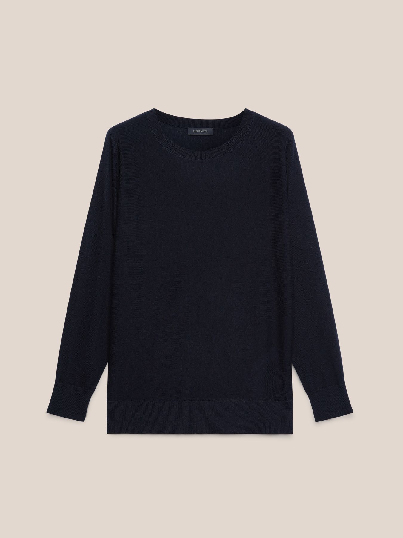 Элегантный джемпер из смесового шелка с добавлением кашемира. Выполнен чулочной вязкой, декорирован английской резинкой по низу изделия, вырез лодочкой.