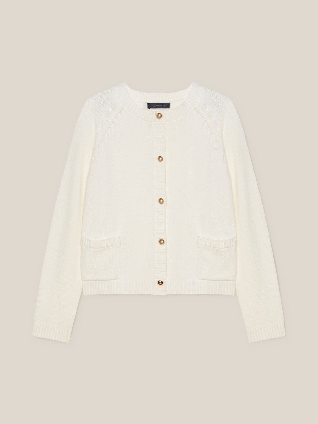 Стильный укороченный кардиган из 100% шерсти. Декорирован накладными карманами и объёмными пуговицами. Манжеты и края выполнены английской резинкой.