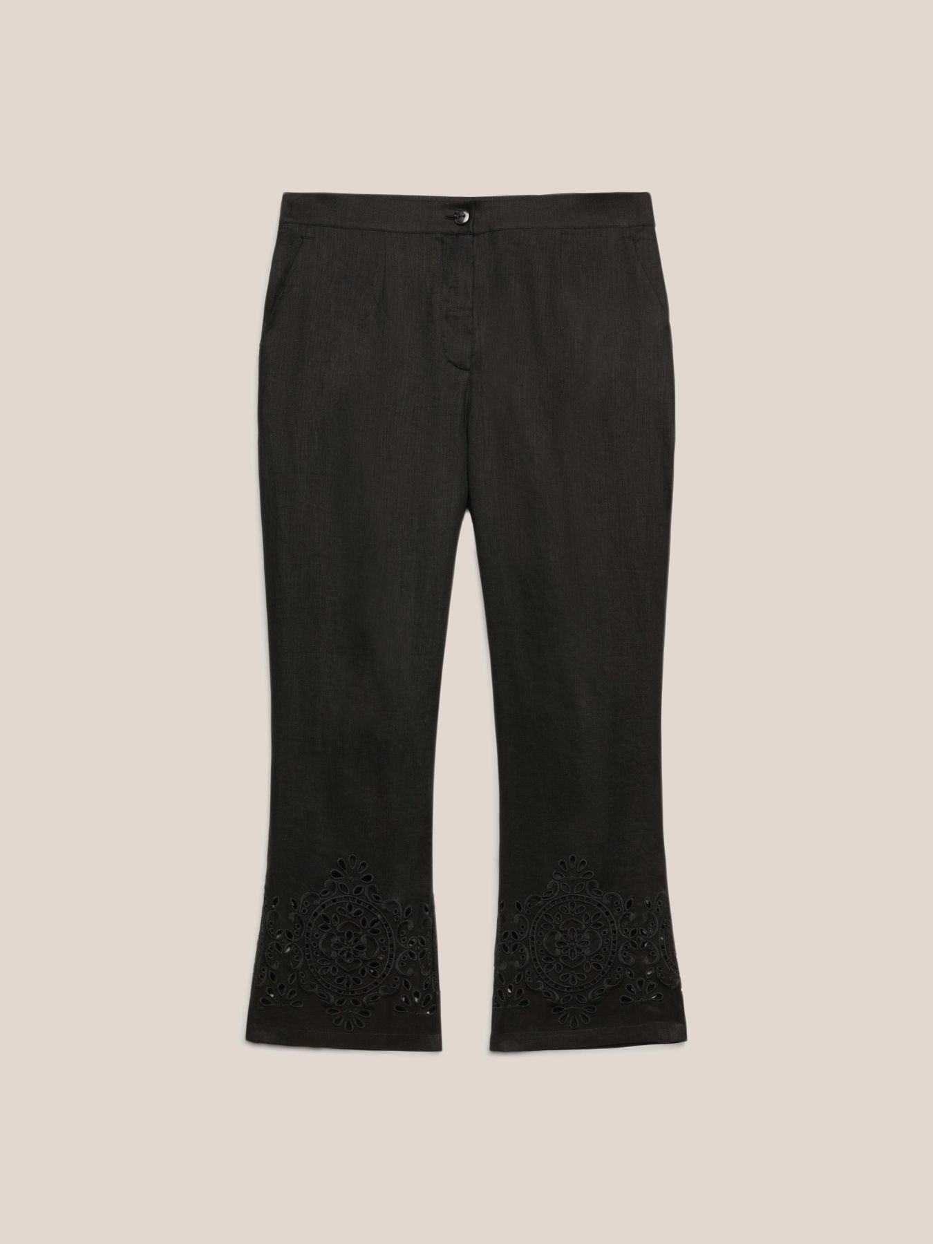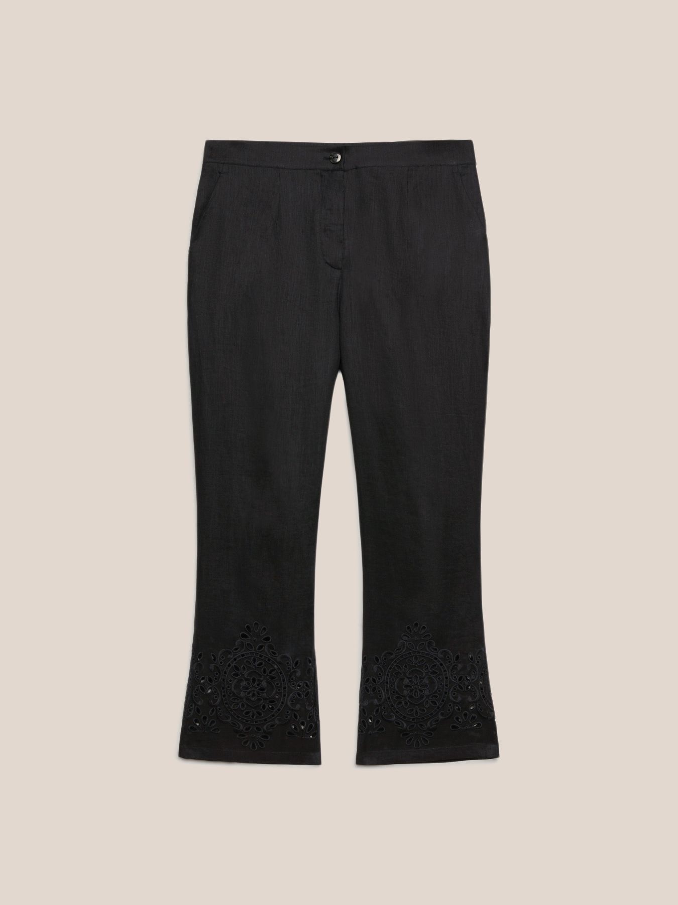 Льняные брюки с акцентной вышивкой и узором в стиле broderie anglaise. Косые карманы, стандартный пояс и вставка на резинке сзади для более комфортной носки. Прекрасный вариант как на каждый день, так и на выход.