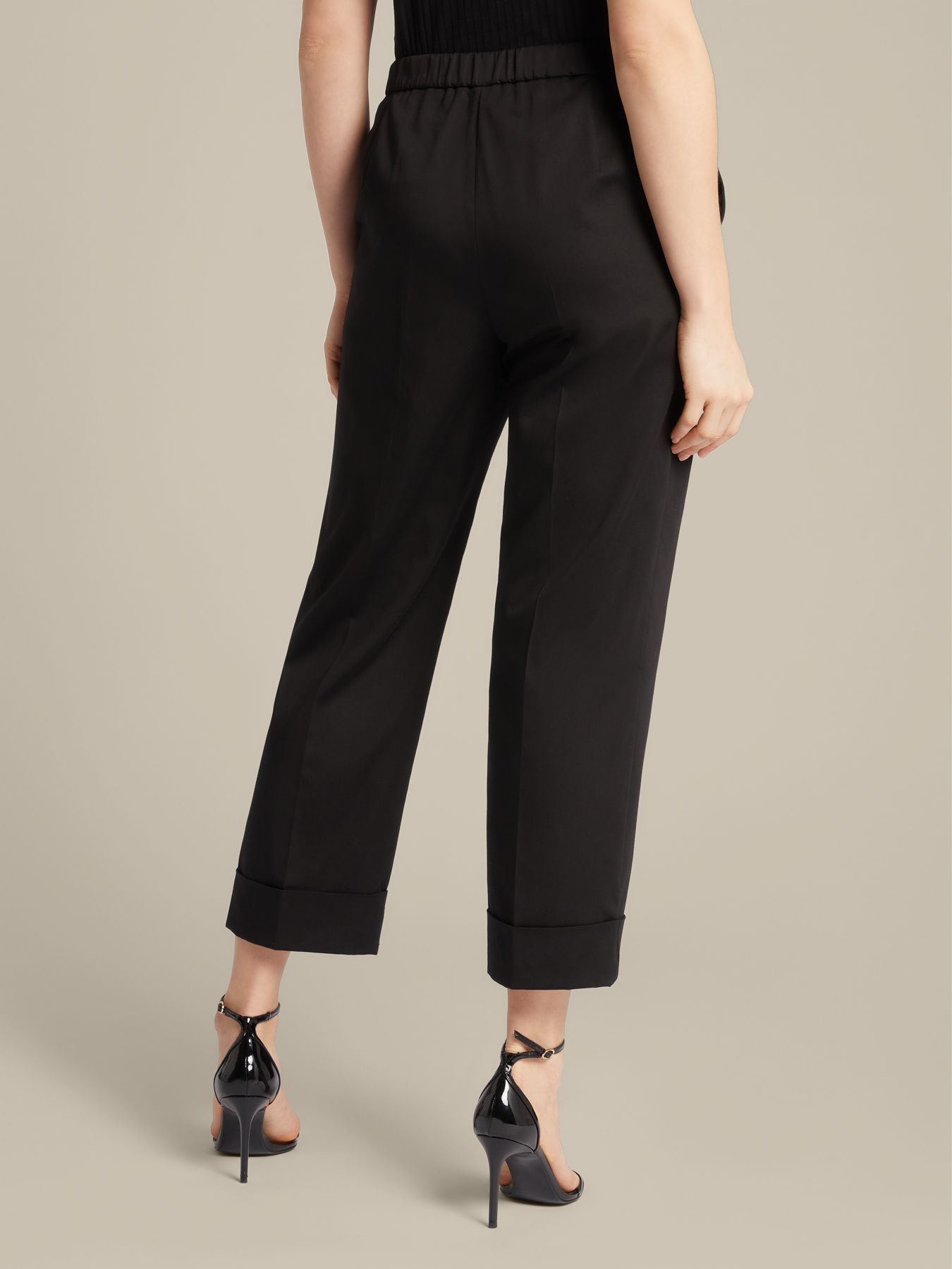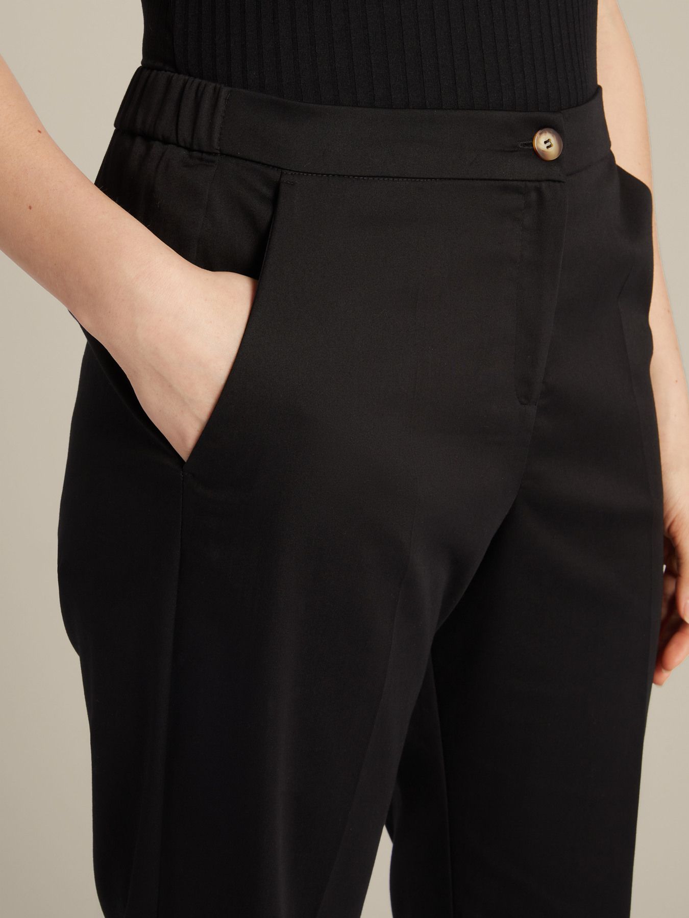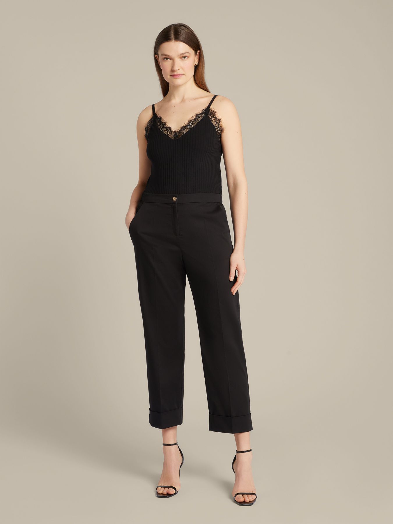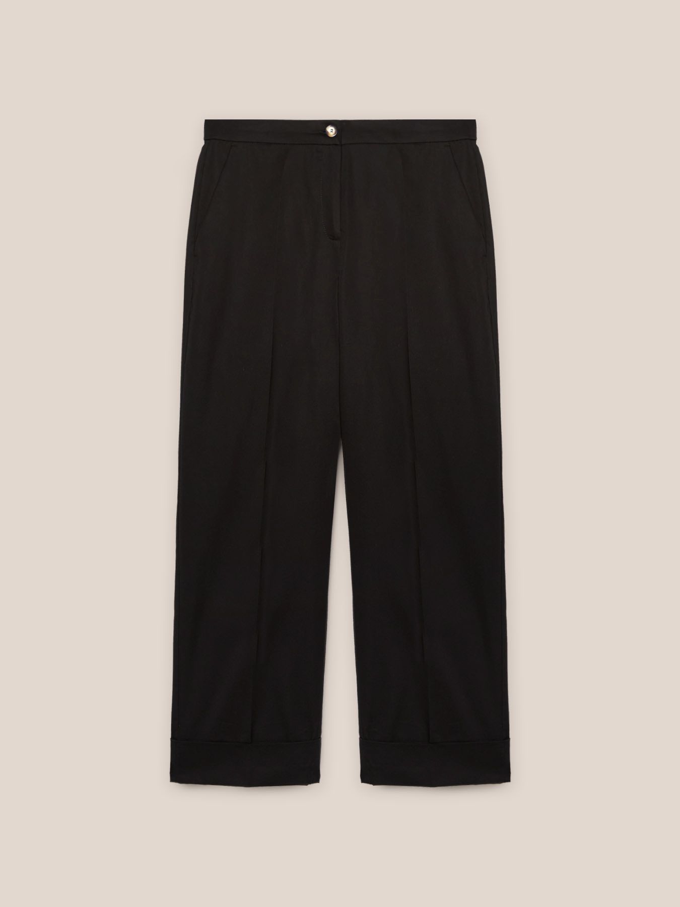 Элегантные укороченные брюки из переработанного хлопка. Стандартная линия талии, косые карманы, пояс с эластичной вставкой сзади, застегиваются на пуговицу и молнию. Укороченная модель с отворотами придаёт современный и изысканный вид. Удачный вариант как на выход, так и для повседневных образов.