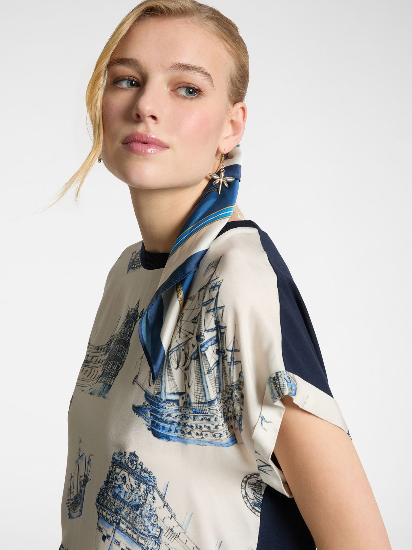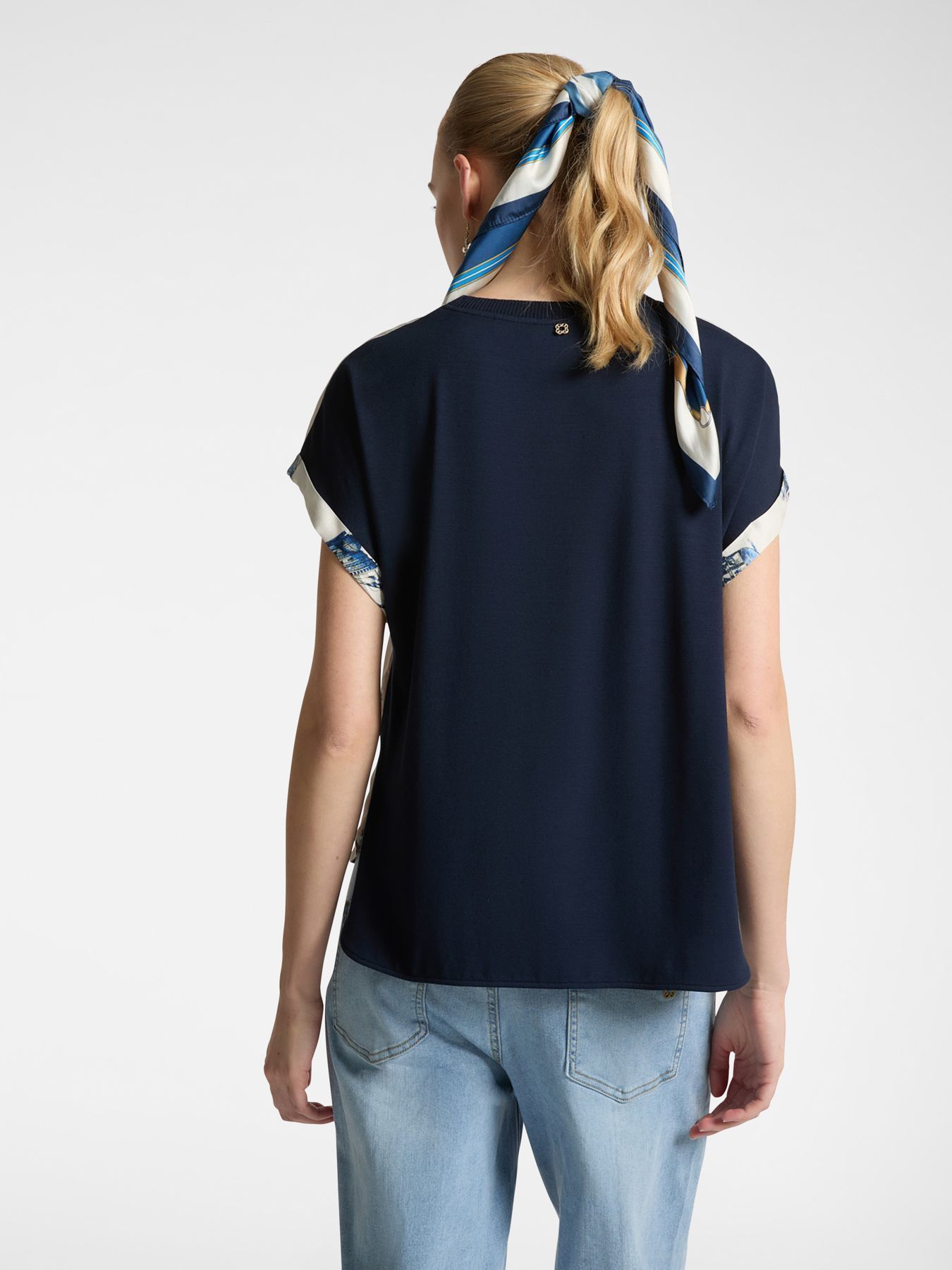 Приятная блузка из двух тканей — вискозного твила и синего джерси. Интересный уникальный дизайн, удобный крой и качественное исполнение. Прекрасно подходит для повседневных образов.